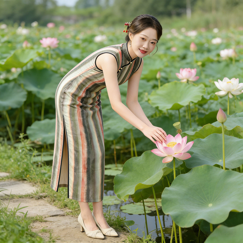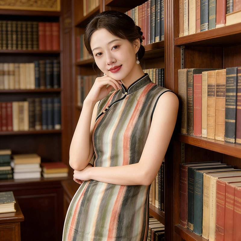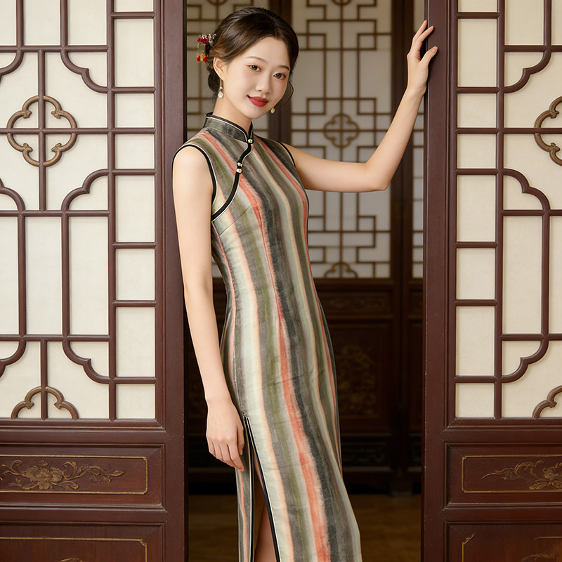 新中式条纹无袖旗袍 夏季薄款连衣裙 修身显瘦日常可穿小个子女