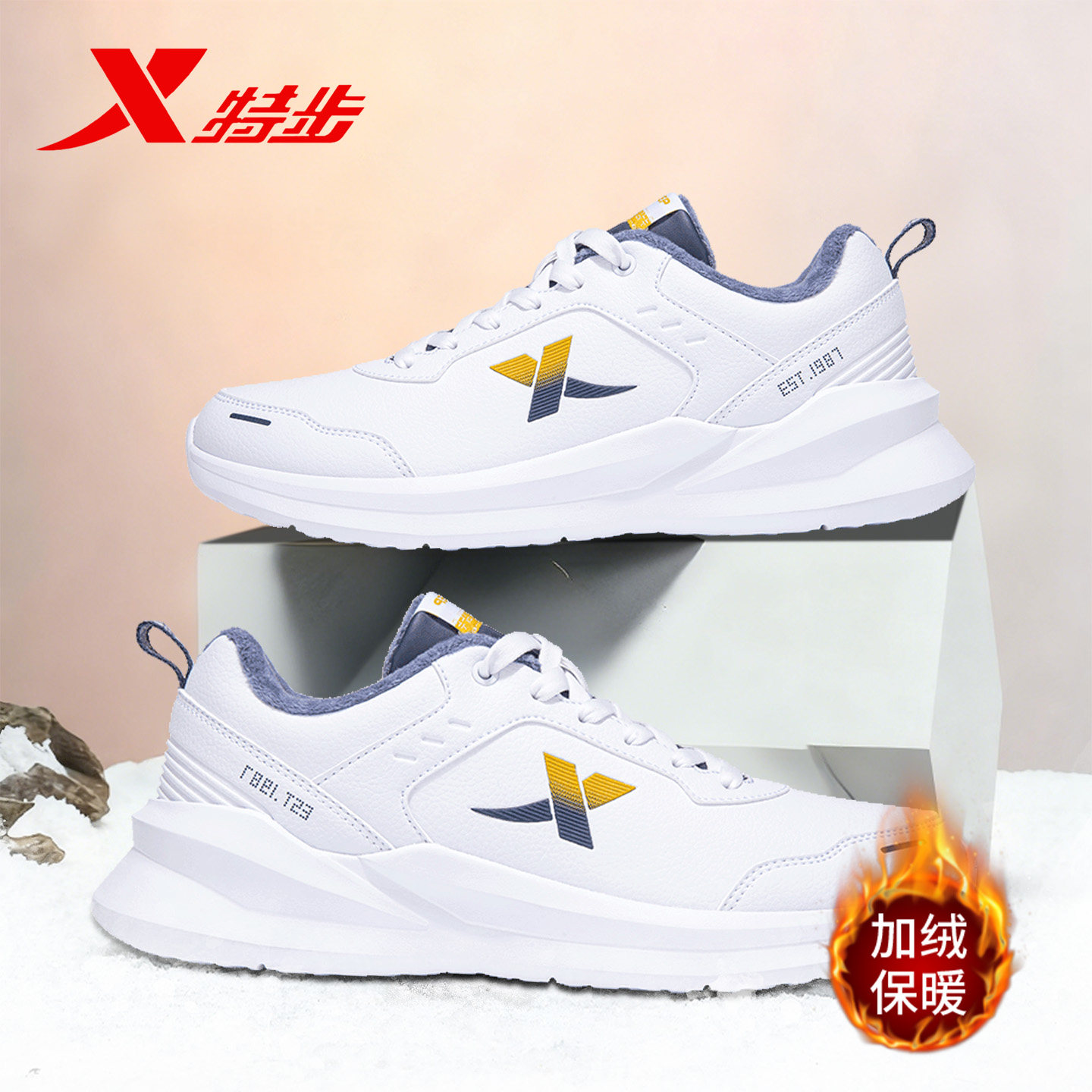 特步官方正品运动鞋男春季加绒保暖男士棉鞋青少年皮面休闲跑步鞋