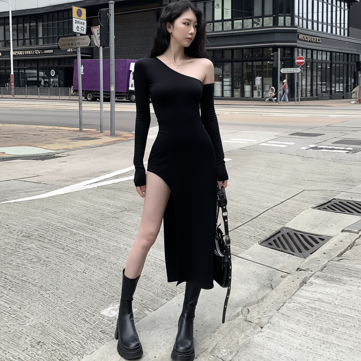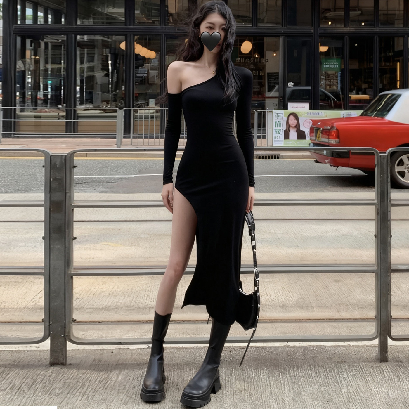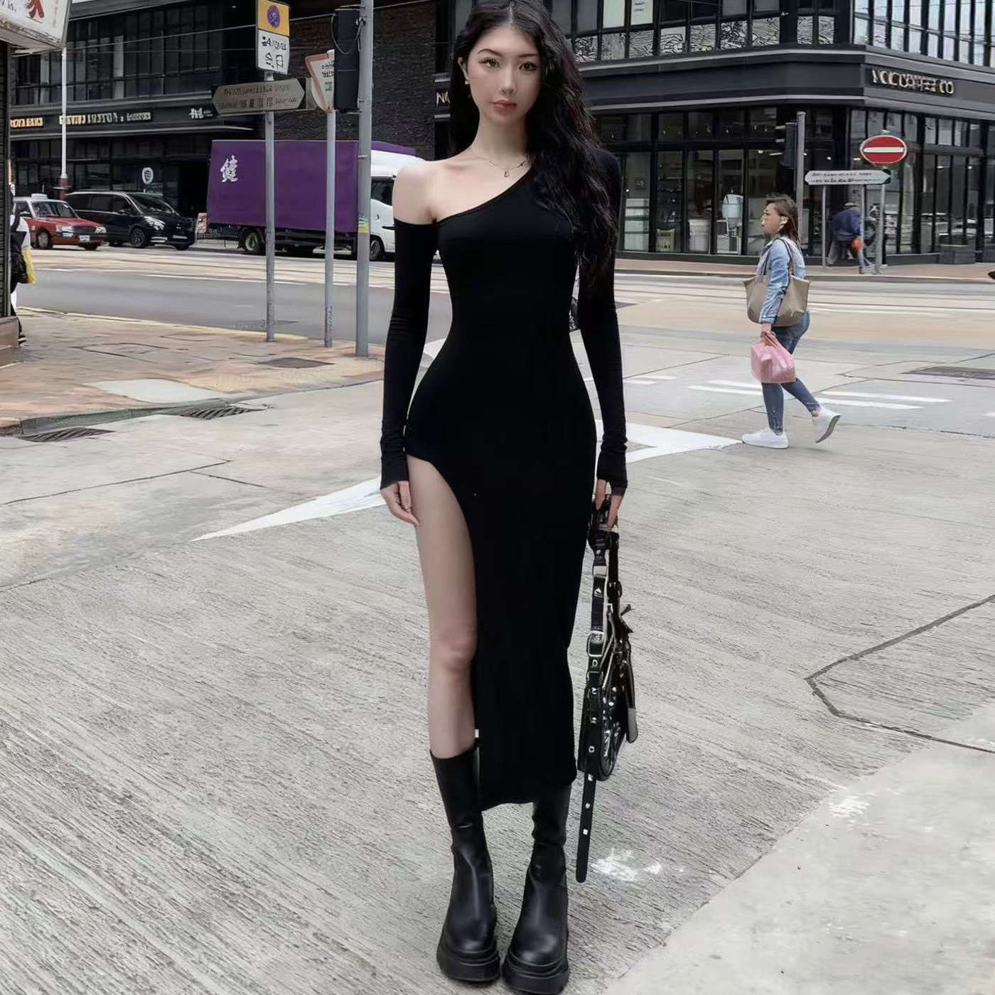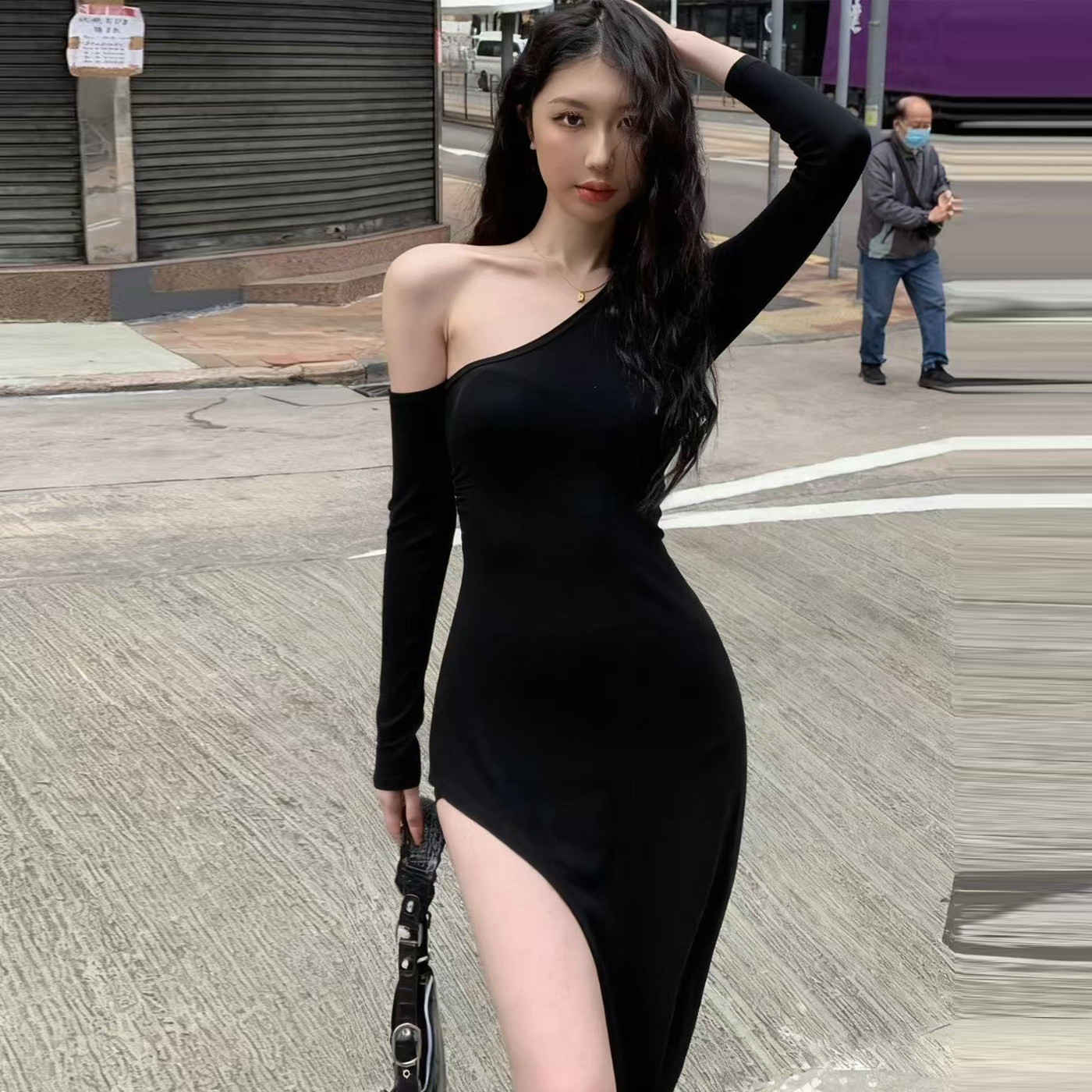 黑色修身斜肩吊带长袖连衣裙女性感气质辣妹开叉长裙收腰包臀裙子