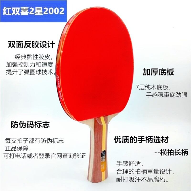 红双喜2星级H2002乒乓球拍双面反胶单支长柄横拍二星直拍短柄2006