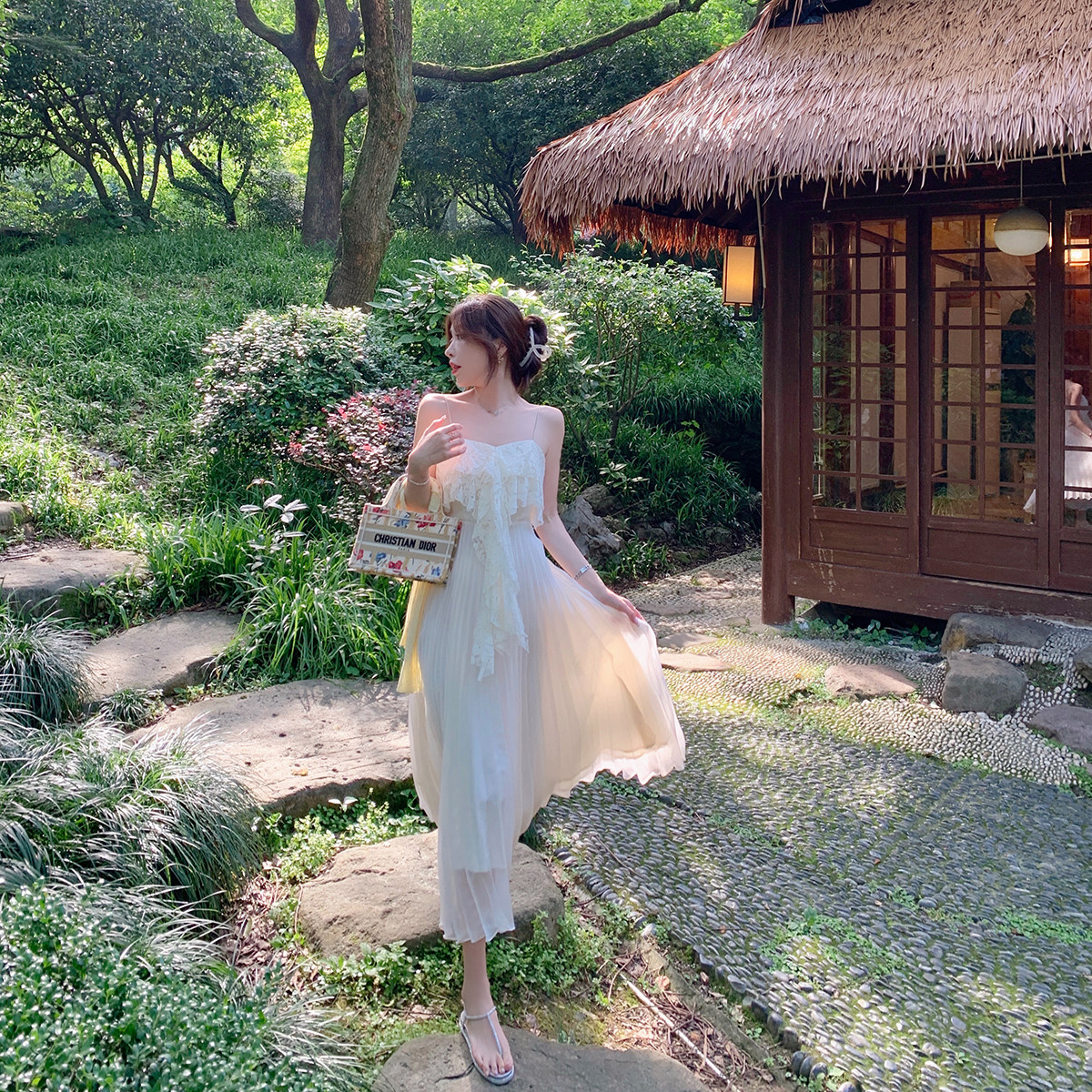 ByYou 夏季白色蕾丝吊带连衣裙高级感气质显白收腰长款百褶仙女裙