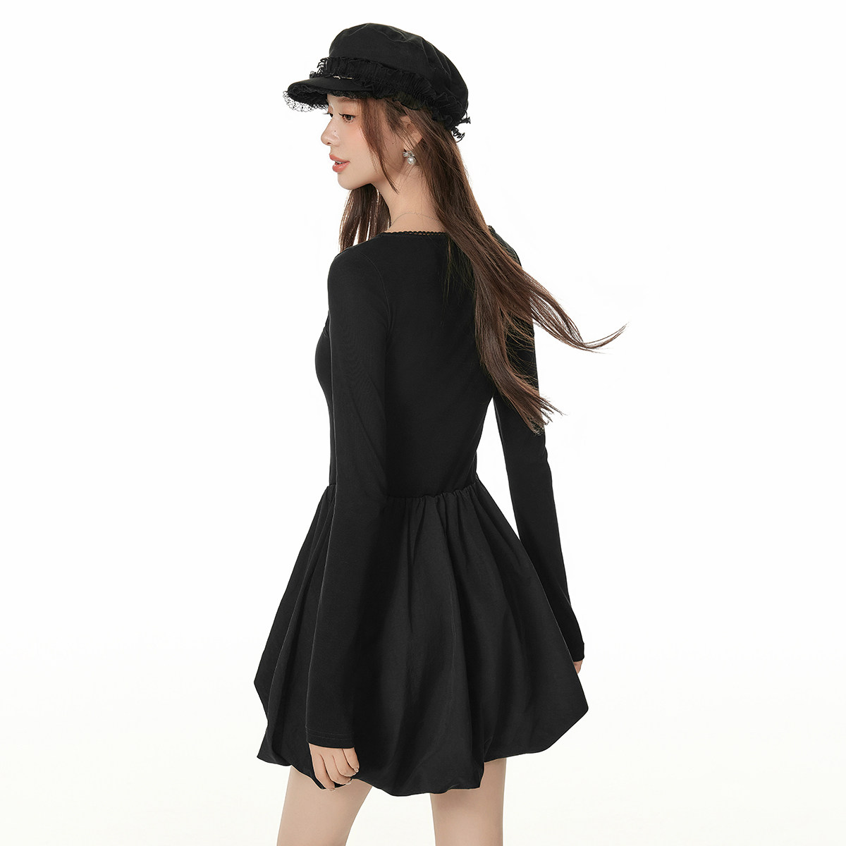 EPTISON长袖连衣裙女2025春夏新款复古修身少女风小个子花苞裙子