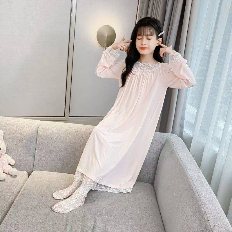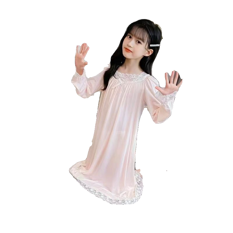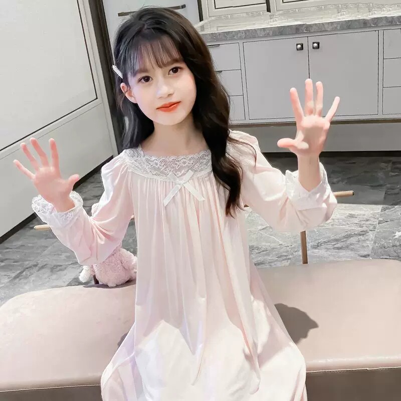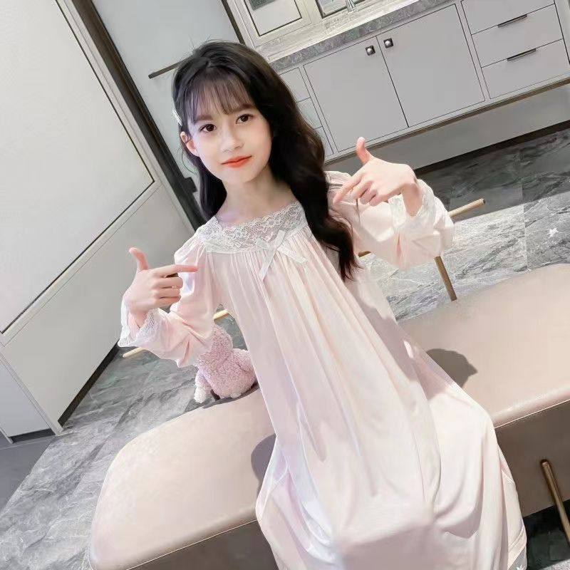 儿童睡裙春秋款新款韩版长袖女童睡裙宽松蕾丝中大童睡衣连衣裙子