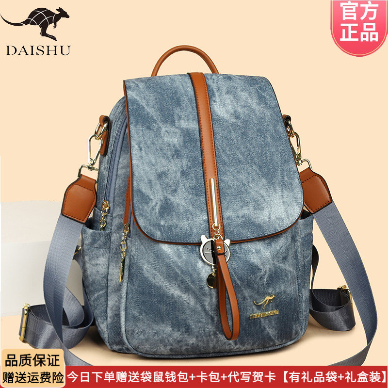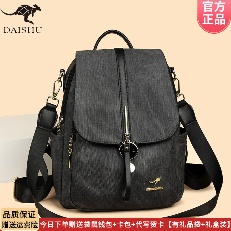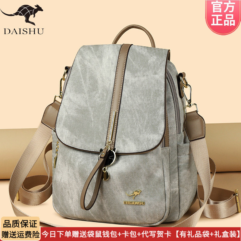 正品袋鼠皮包双肩包女旅游轻便2026新款时尚双肩背包旅行背包女士