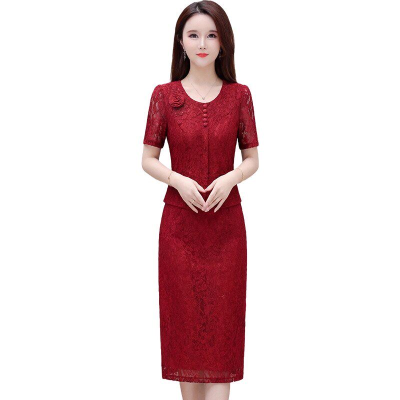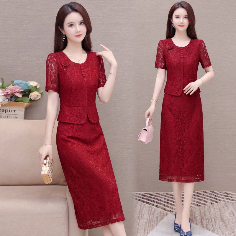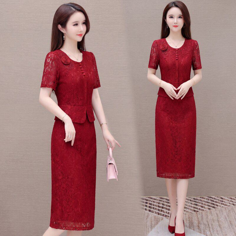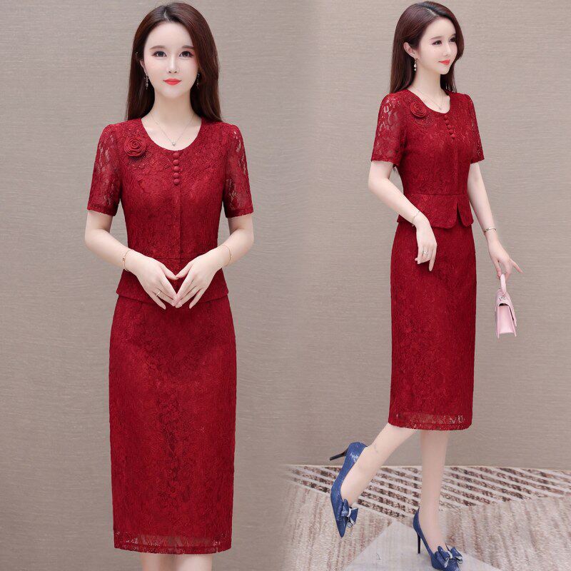 红色蕾丝假两件连衣裙女2026夏季新款修身显瘦通勤轻奢高级感礼服