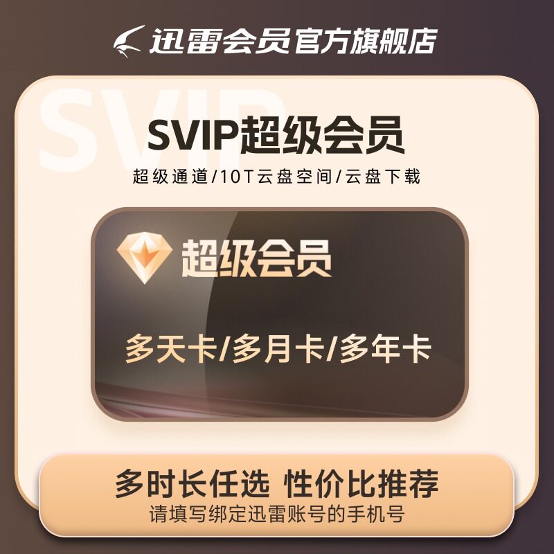 迅雷超级会员svip周月季年卡等超级加速10T云盘官方直充填手机号