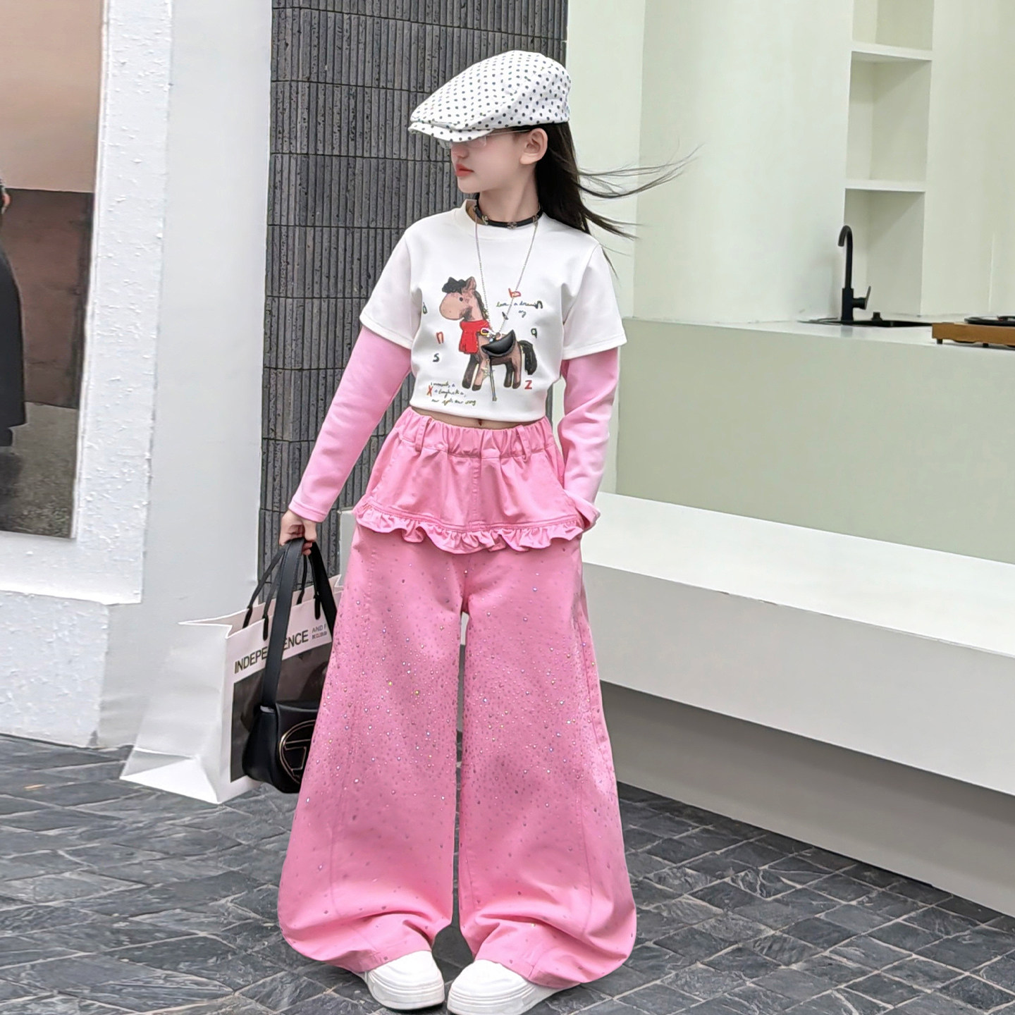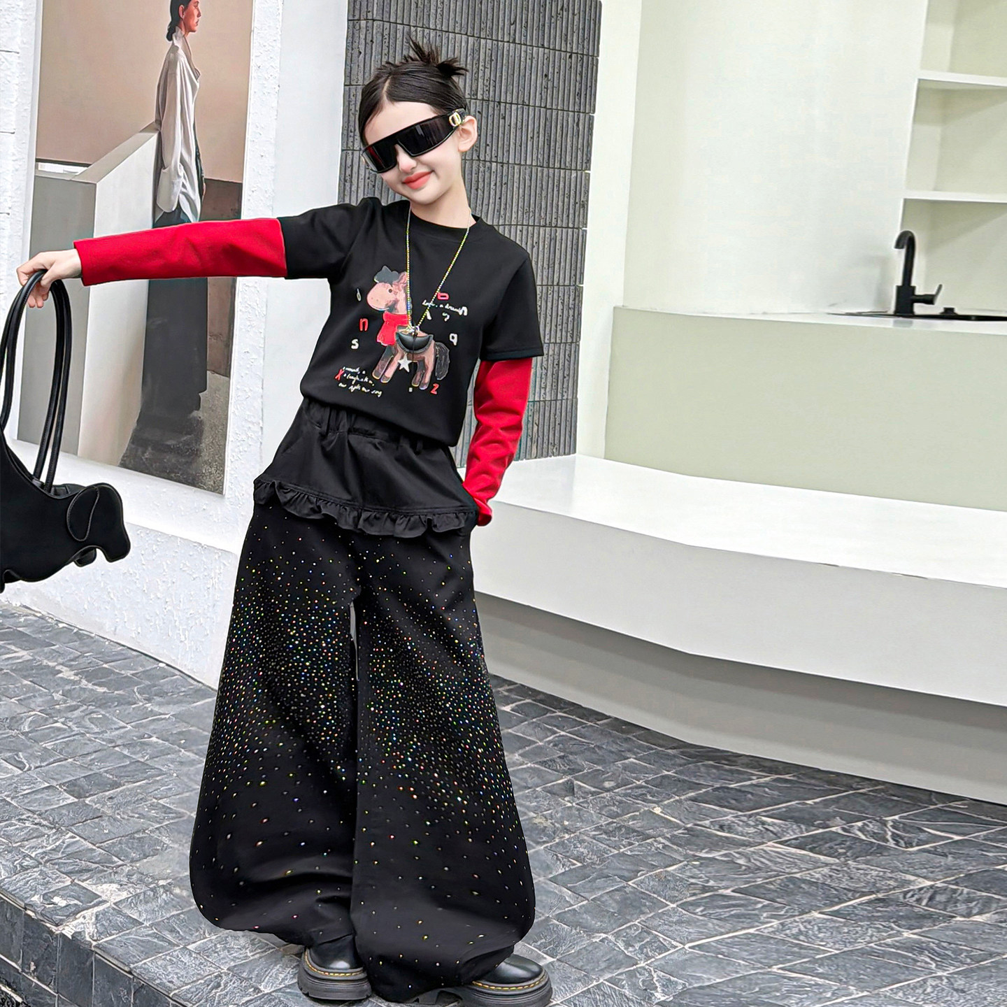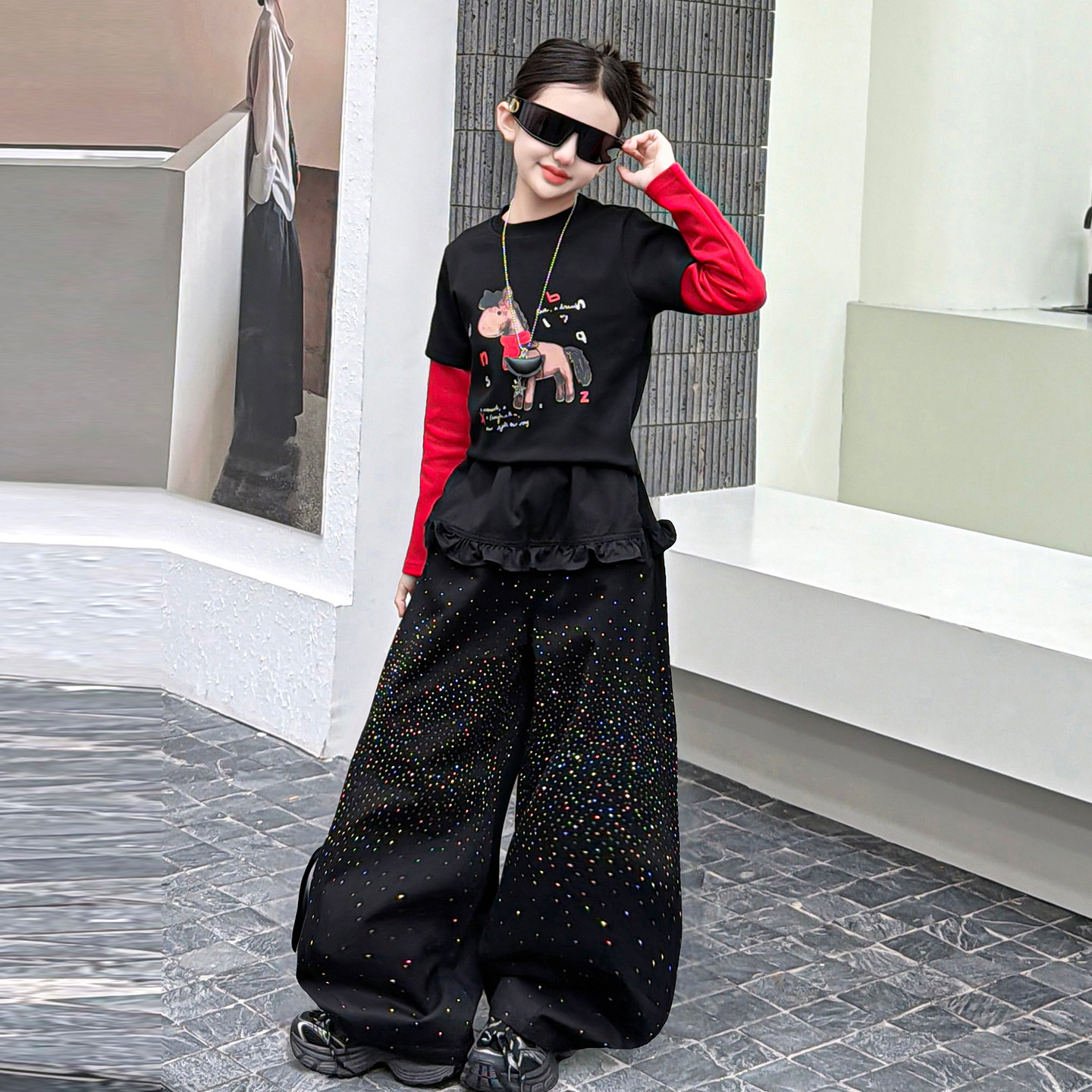 女童小马假两件2026春款中大童时尚百搭T恤阔腿裤子女生爆款套装