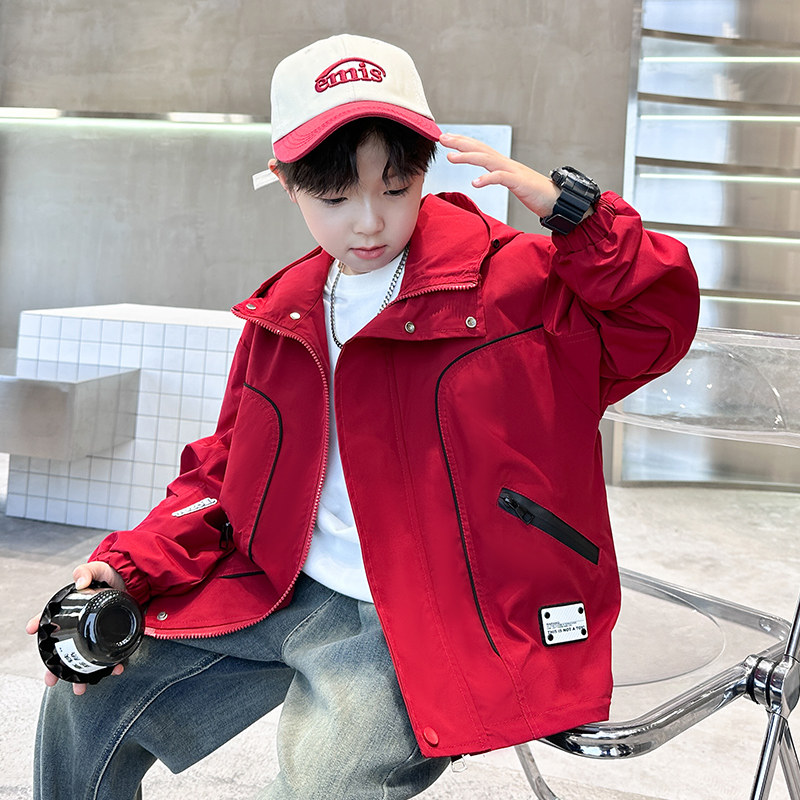 男童春装外套2026新款洋气中大儿童帅气冲锋衣春秋款红色连帽风衣