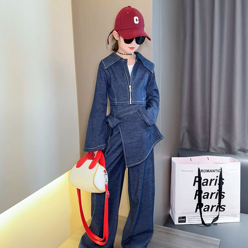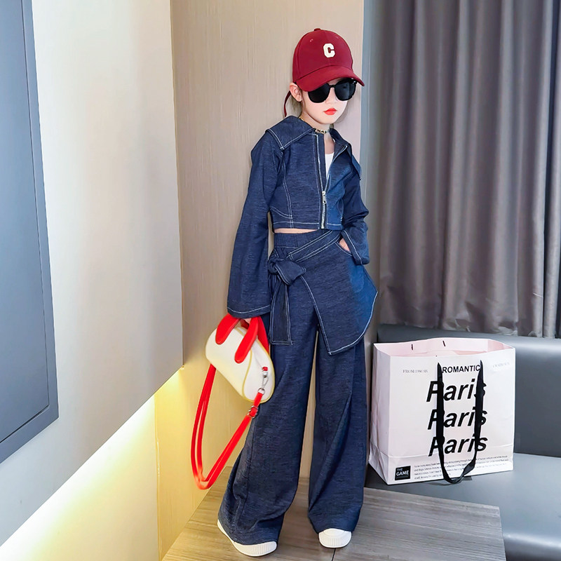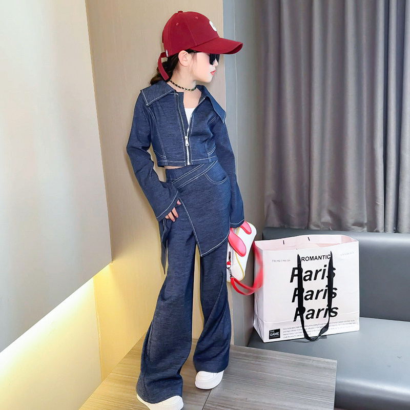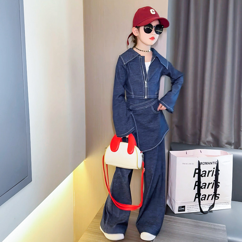 女童春装套装2026新款儿童春款牛仔外套屁帘大童女孩阔腿裤三件套