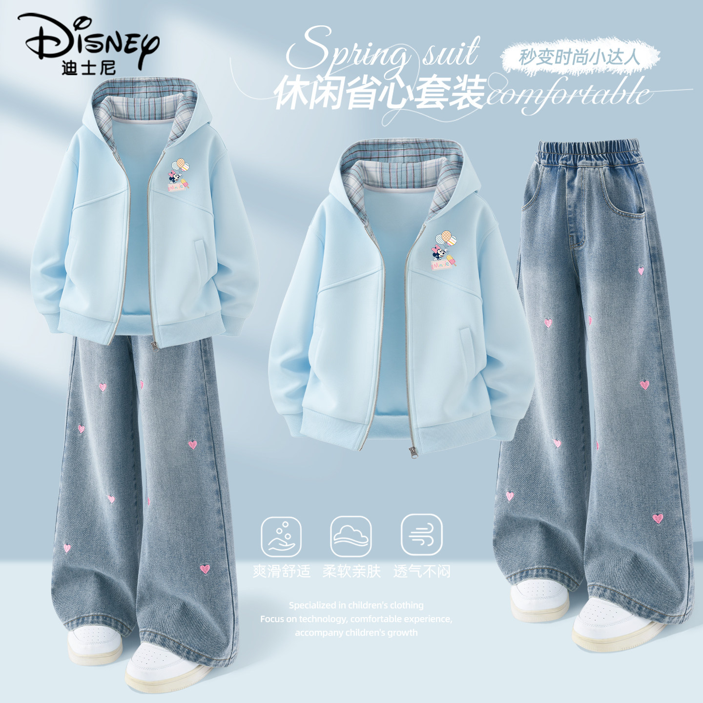 迪士尼女童春装套装春秋款2026新款春季女孩外套洋气儿童牛仔裤潮