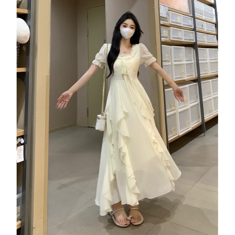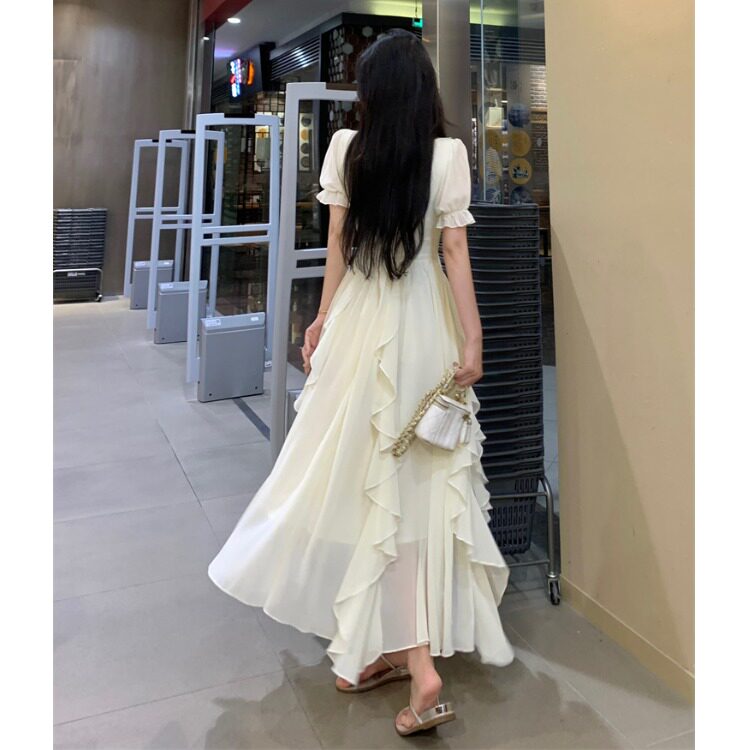 大码法式仙女短袖雪纺连衣裙女夏季微胖mm遮肚显瘦海边度假长裙子