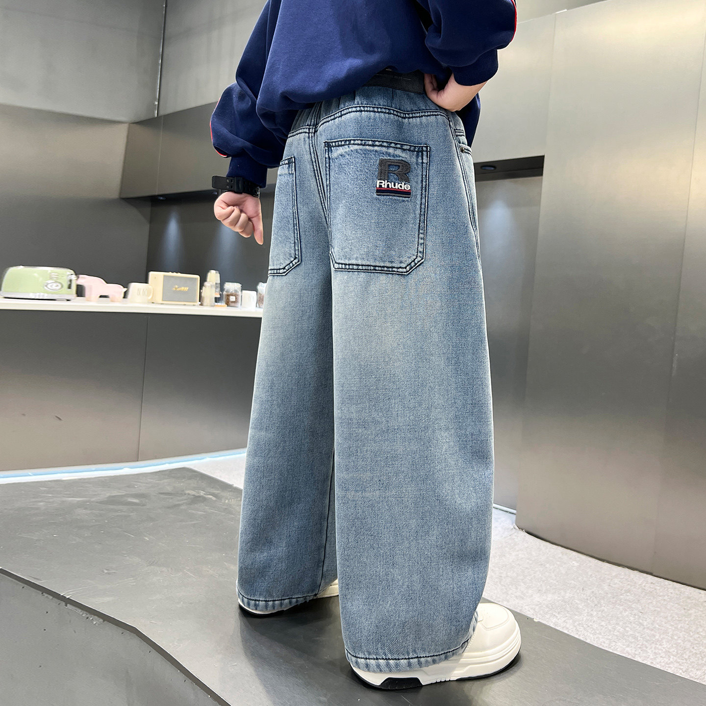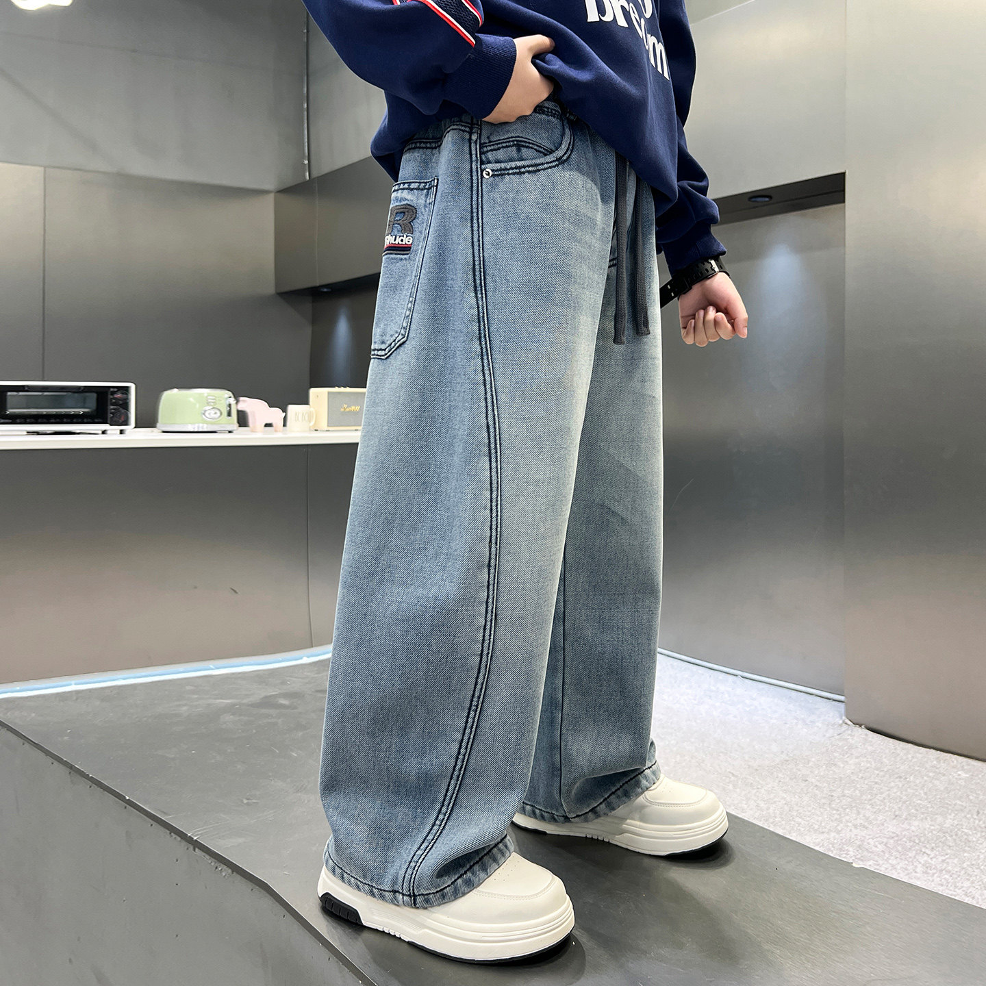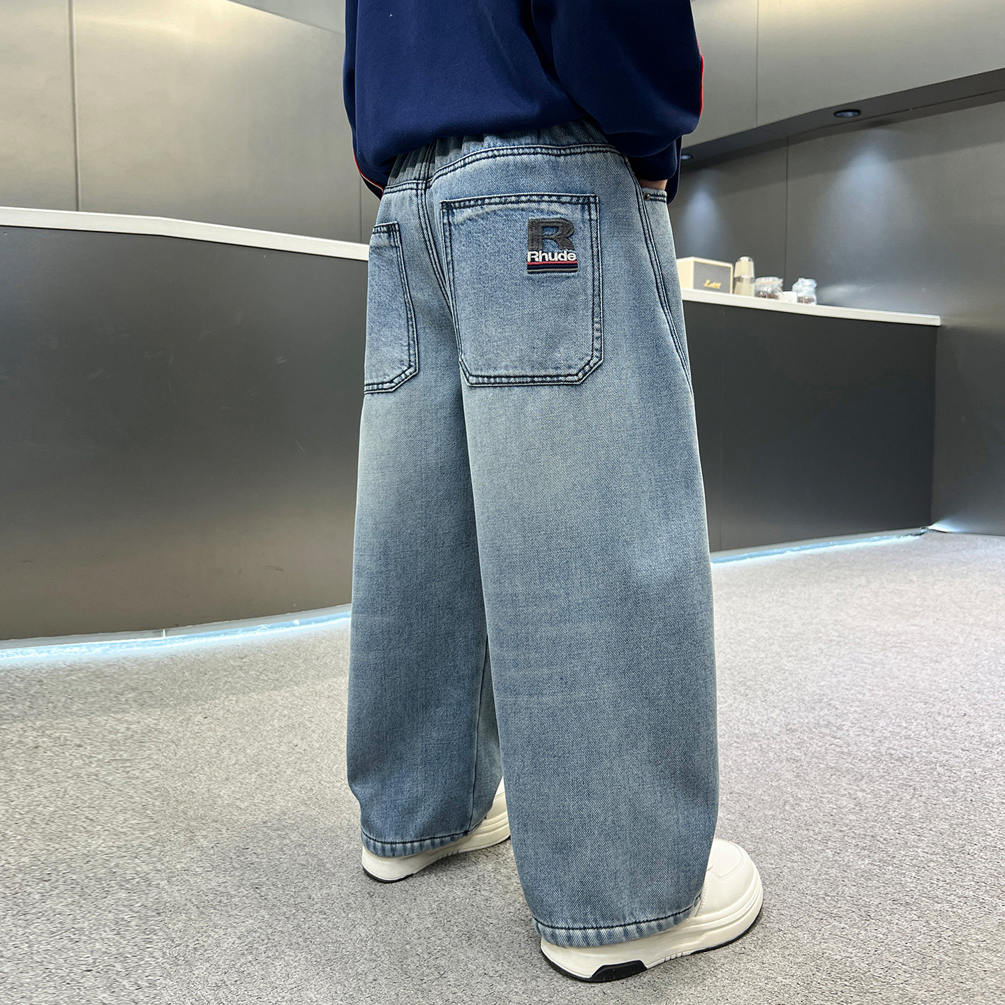 男童冬装韩范加绒直筒弯刀牛仔裤2025新款青少年儿童加厚阔腿裤子