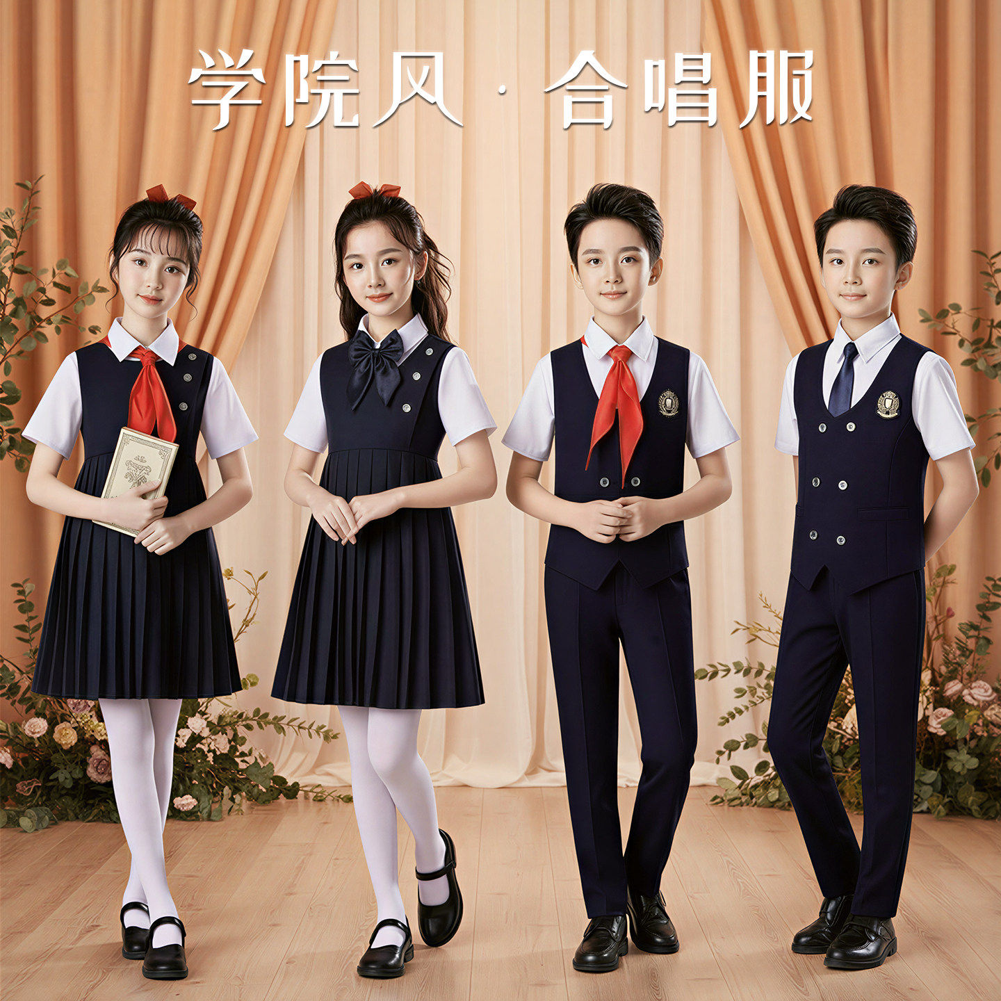 儿童合唱爱国朗诵比赛演出服女童小学生唱歌蓝色演讲主持人礼服装
