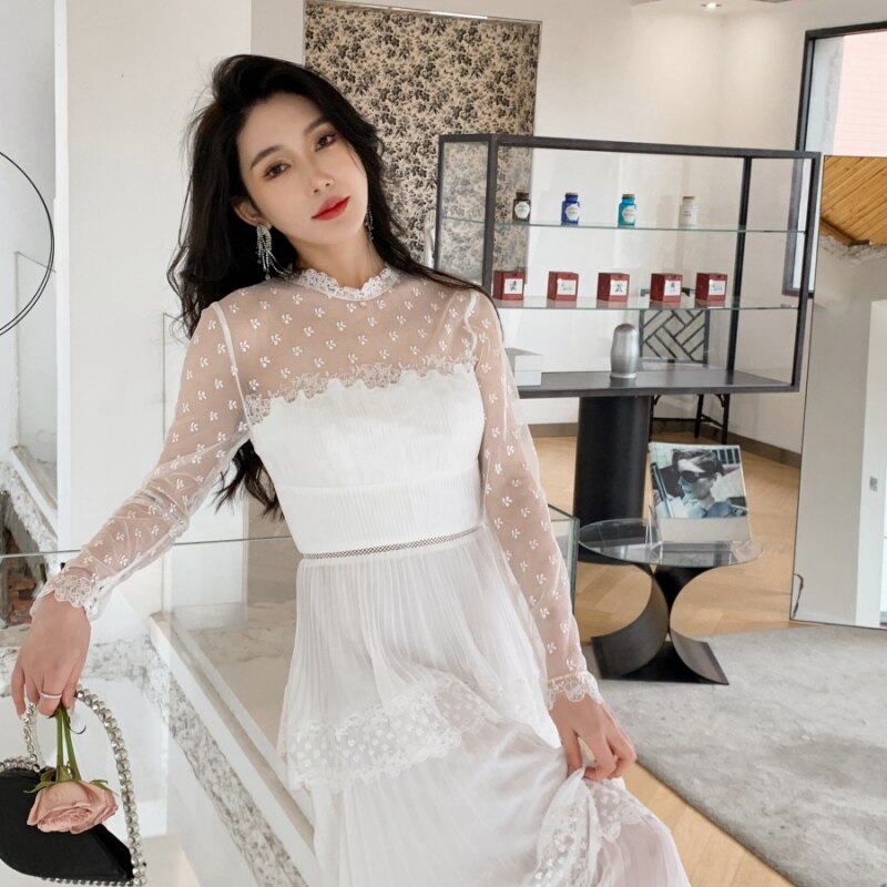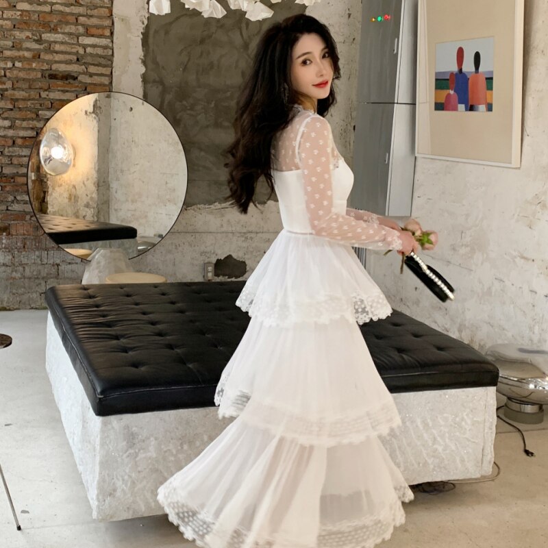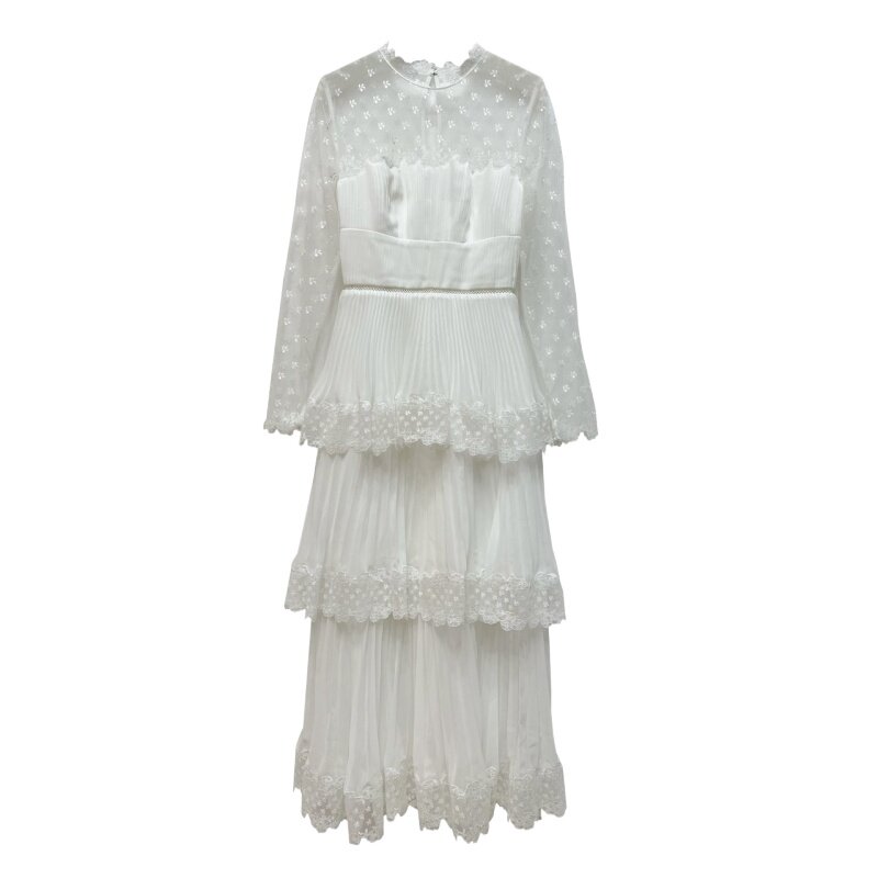 设计感小众性感透视蕾丝拼接雪纺百褶长裙白色仙气显瘦蛋糕连衣裙