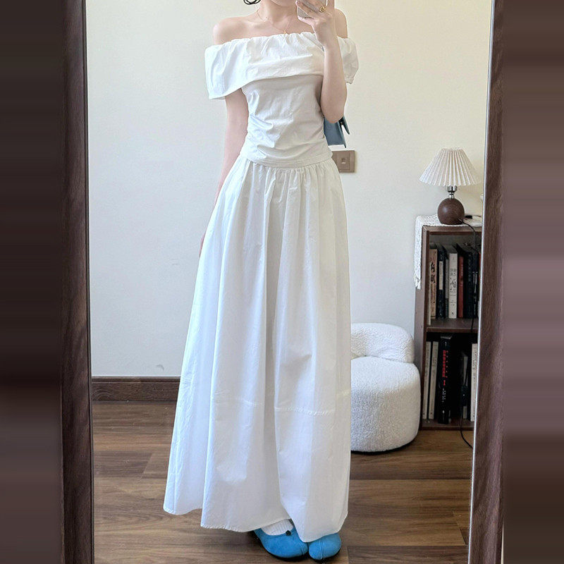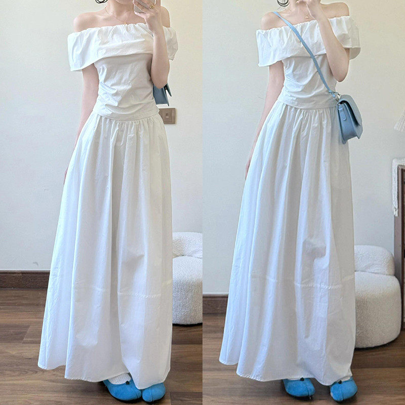 小个子白色一字肩洋装子女夏2026新款今年流行爆款掐腰套装长裙