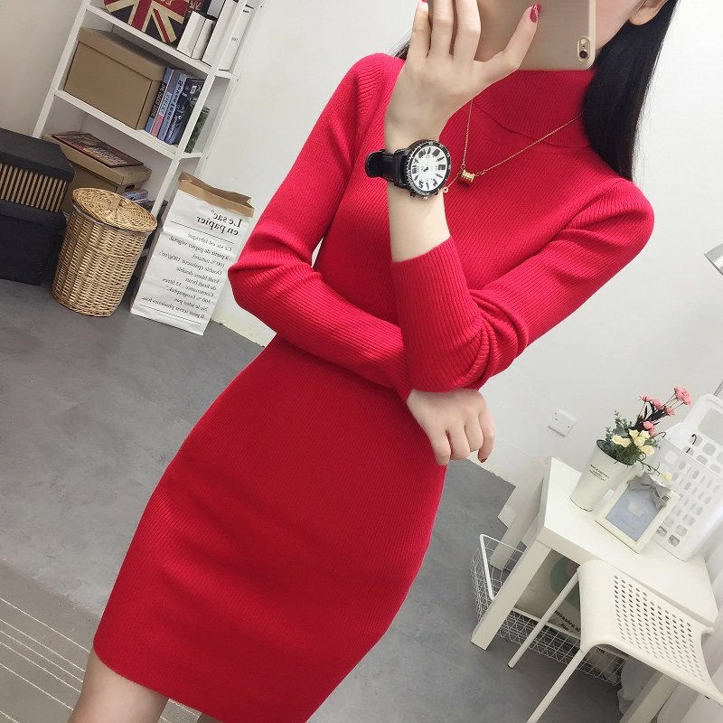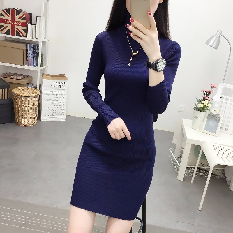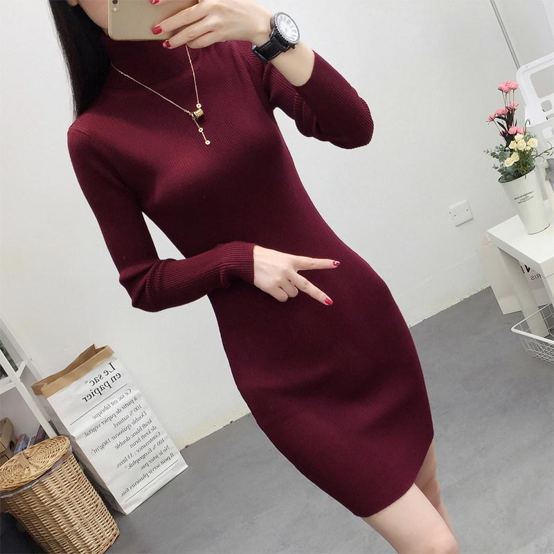 2022韩版针织衫女秋冬连衣裙中长款高领修身长袖毛衣打底裙包臀潮