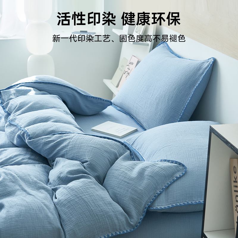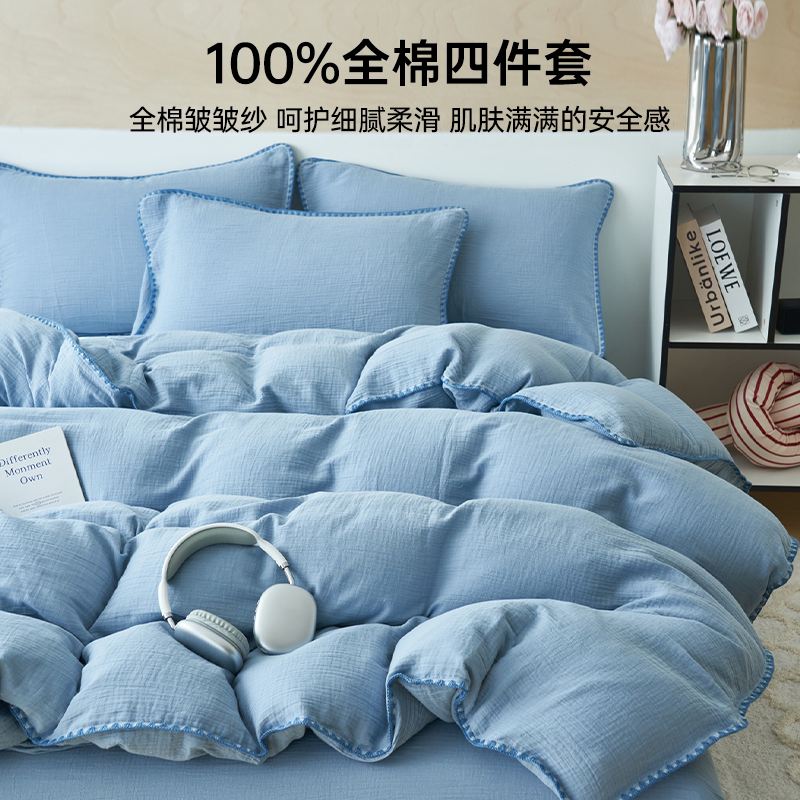 无印良品A类纯棉皱皱纱四件套2026新款全棉被套纯色床单三件套