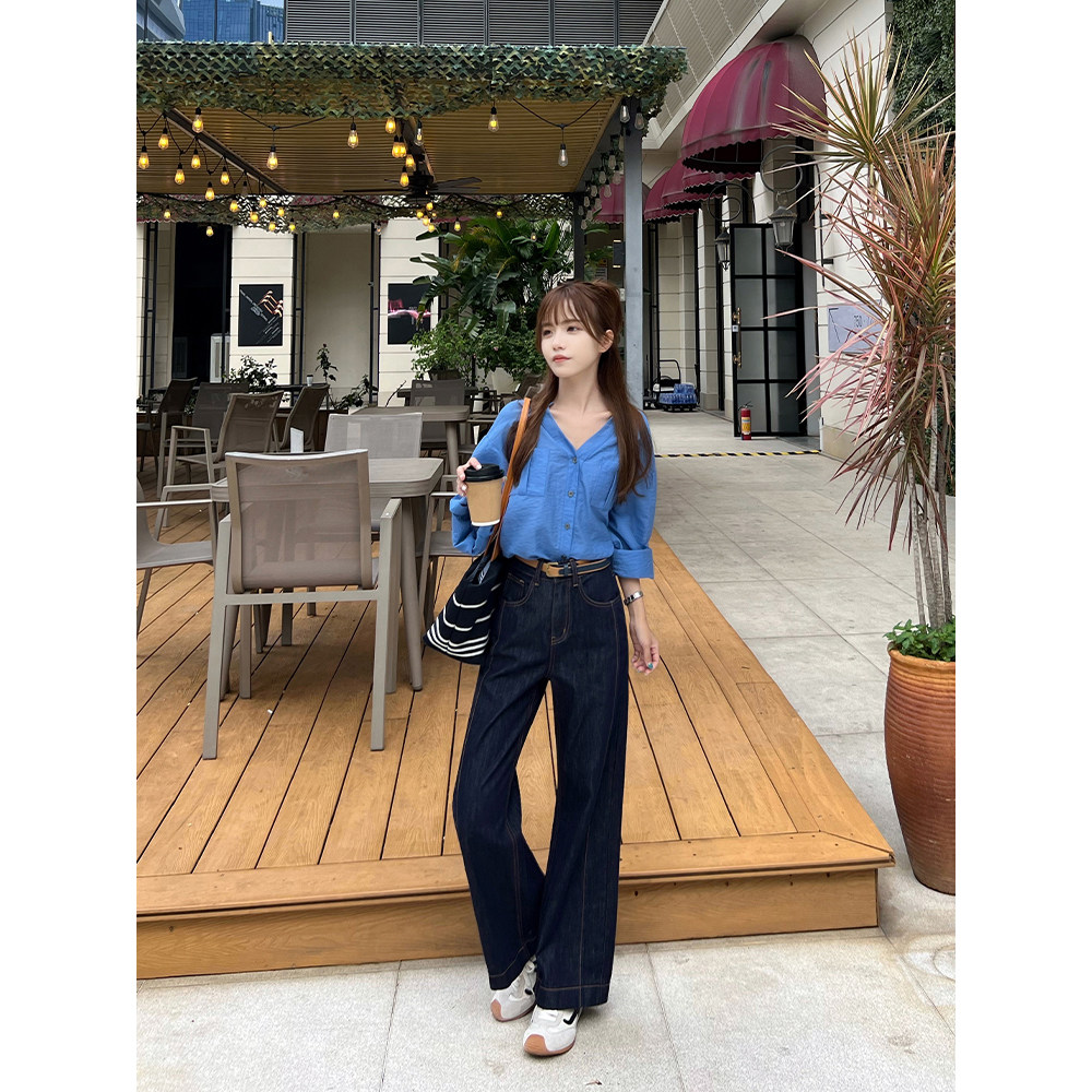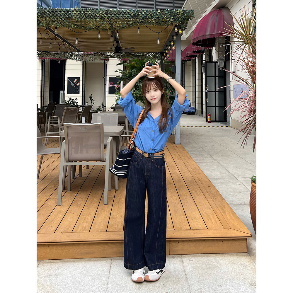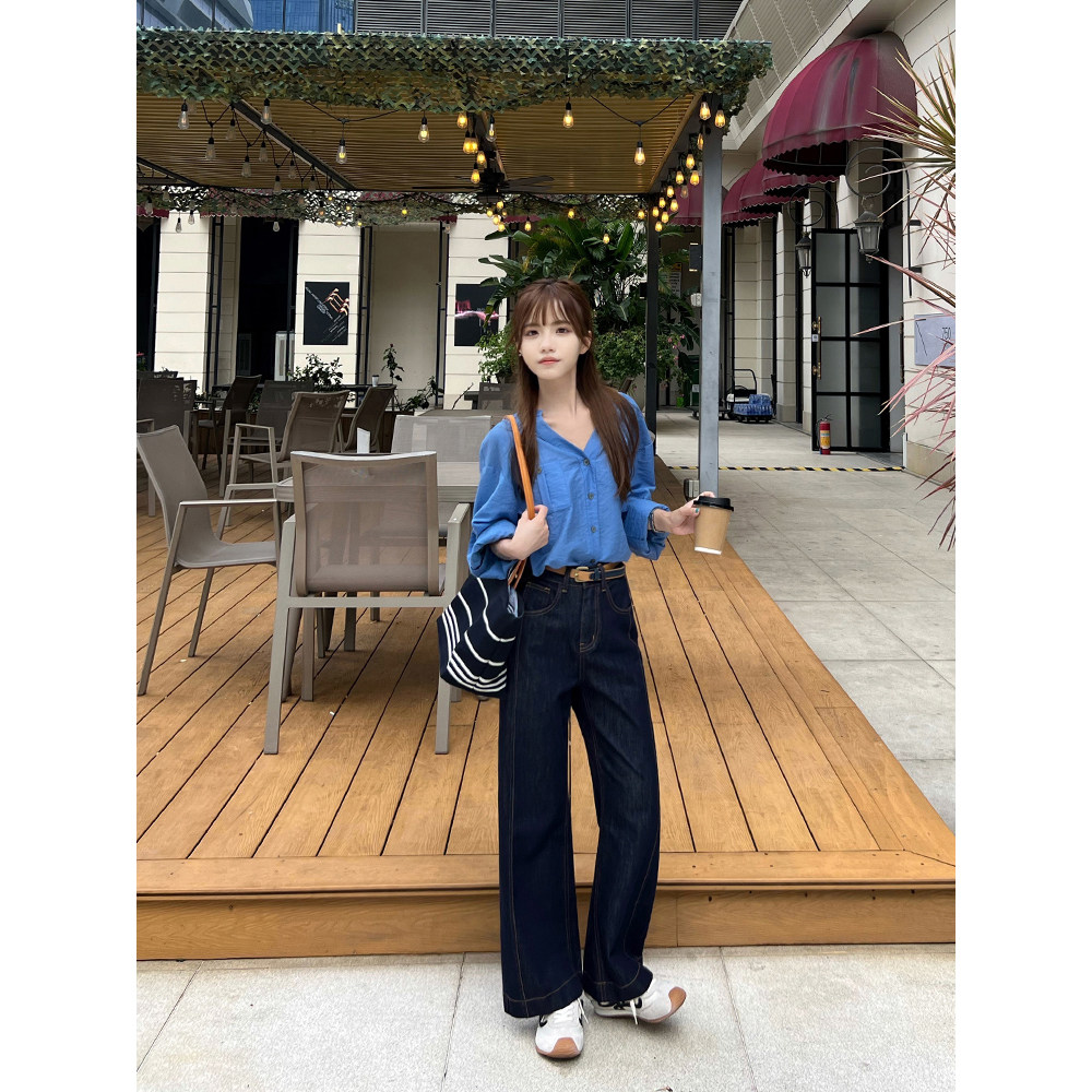 王家有鱼小个子丹宁色阔腿裤女款2025年新款时尚百搭直筒牛仔裤子