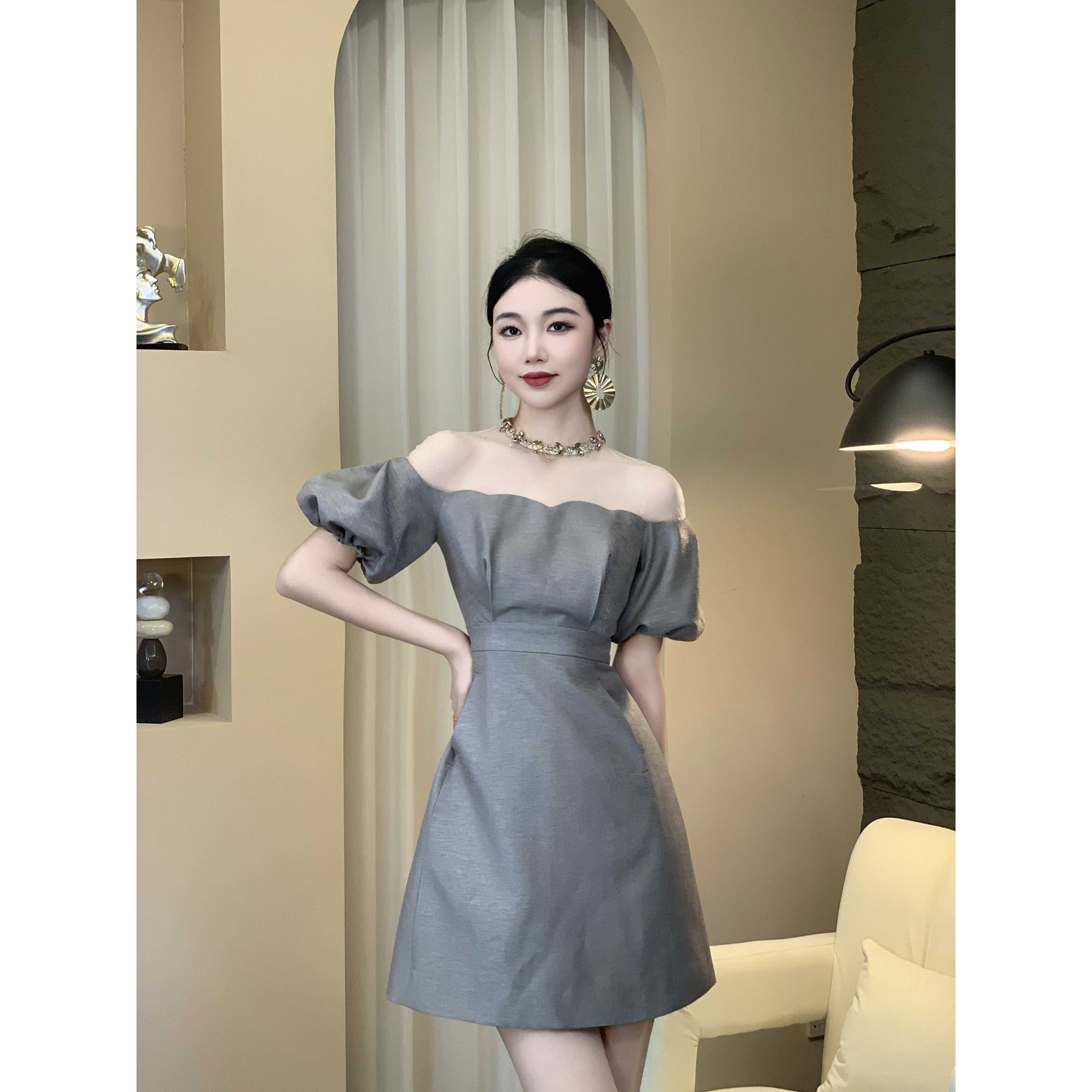 短款一字肩中袖时尚a字小黑裙女装蕾丝拼接收腰显瘦气质连衣裙