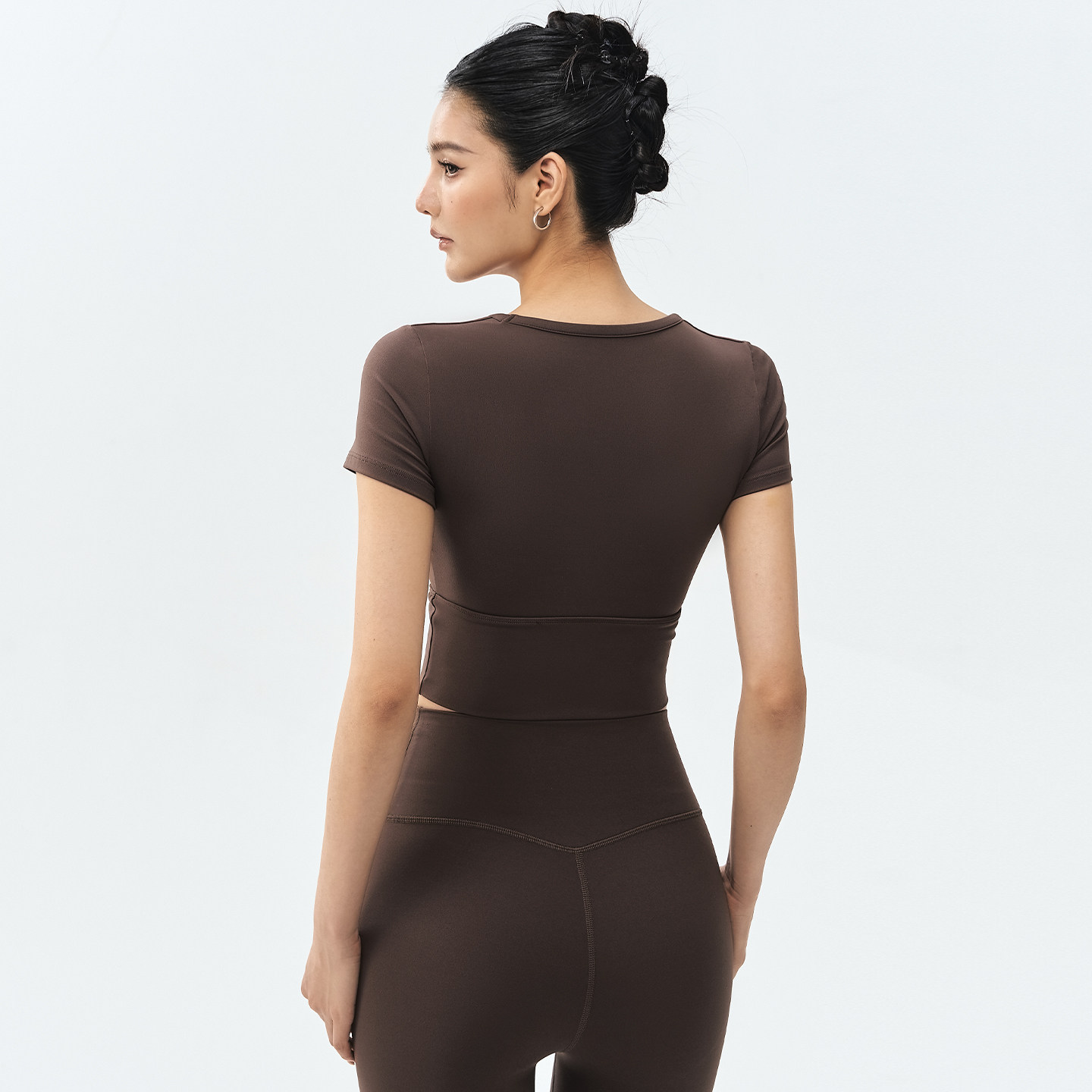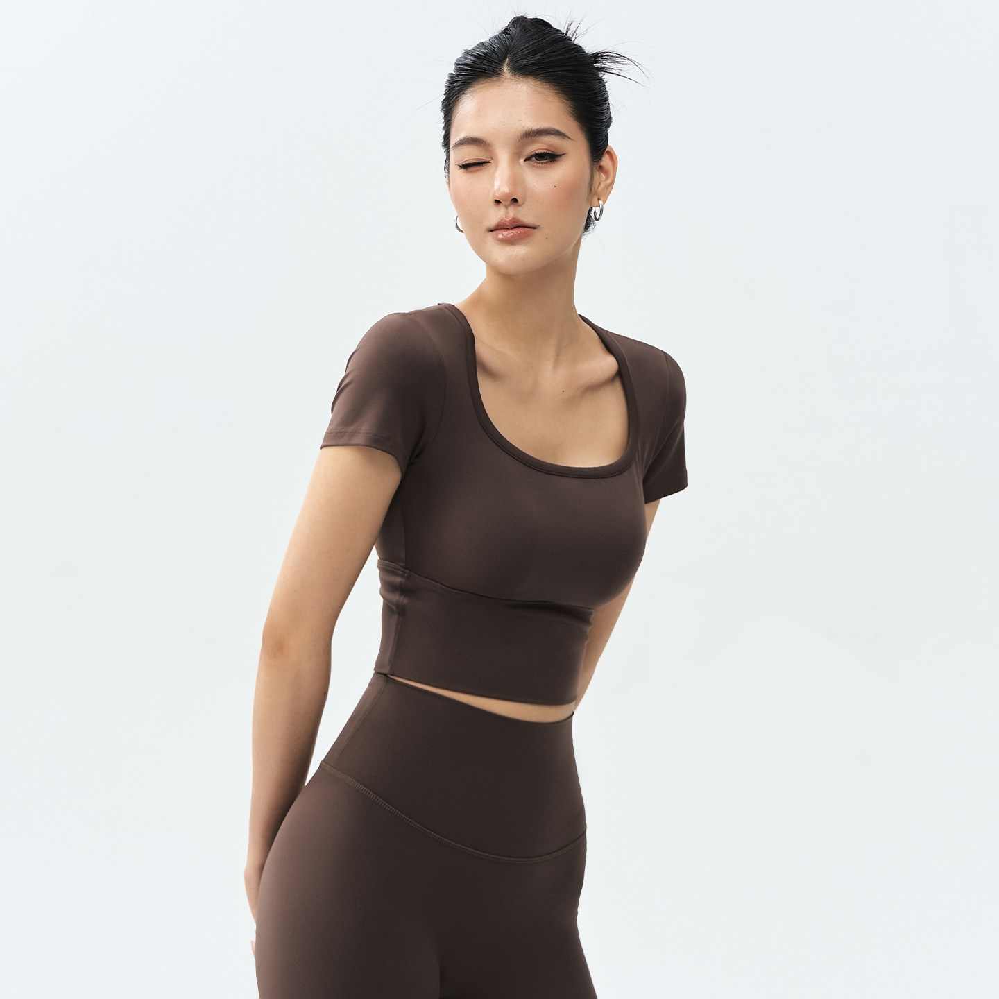 DCW带胸垫运动短袖女紧身显瘦短款方领健身上衣跑步训练瑜伽服t恤