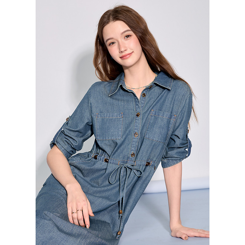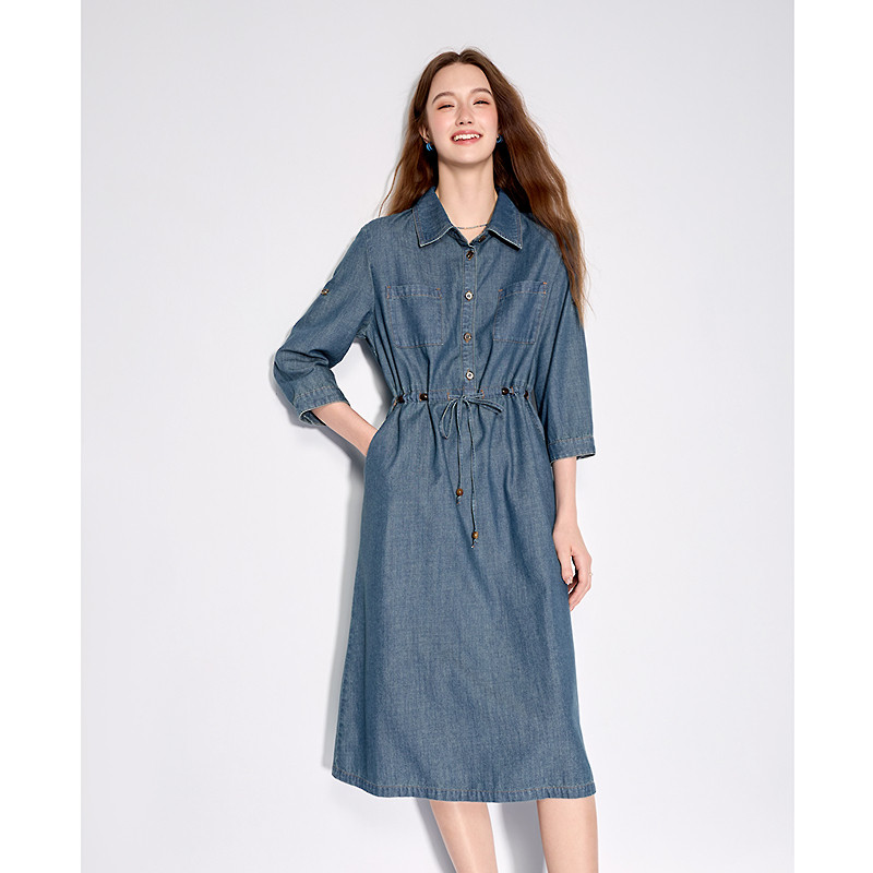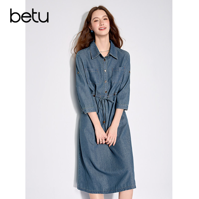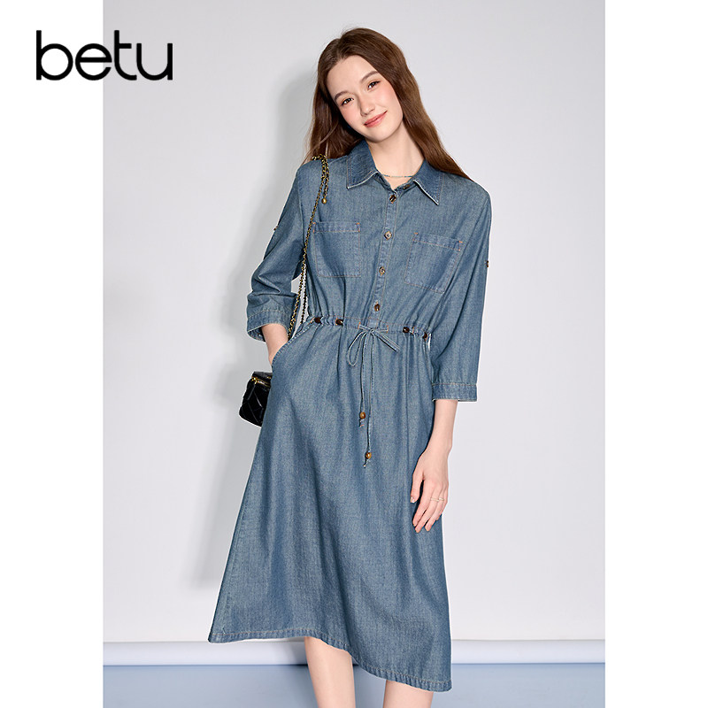 betu百图抽绳显瘦牛仔衬衫裙女2026年春季新款复古七分袖连衣裙
