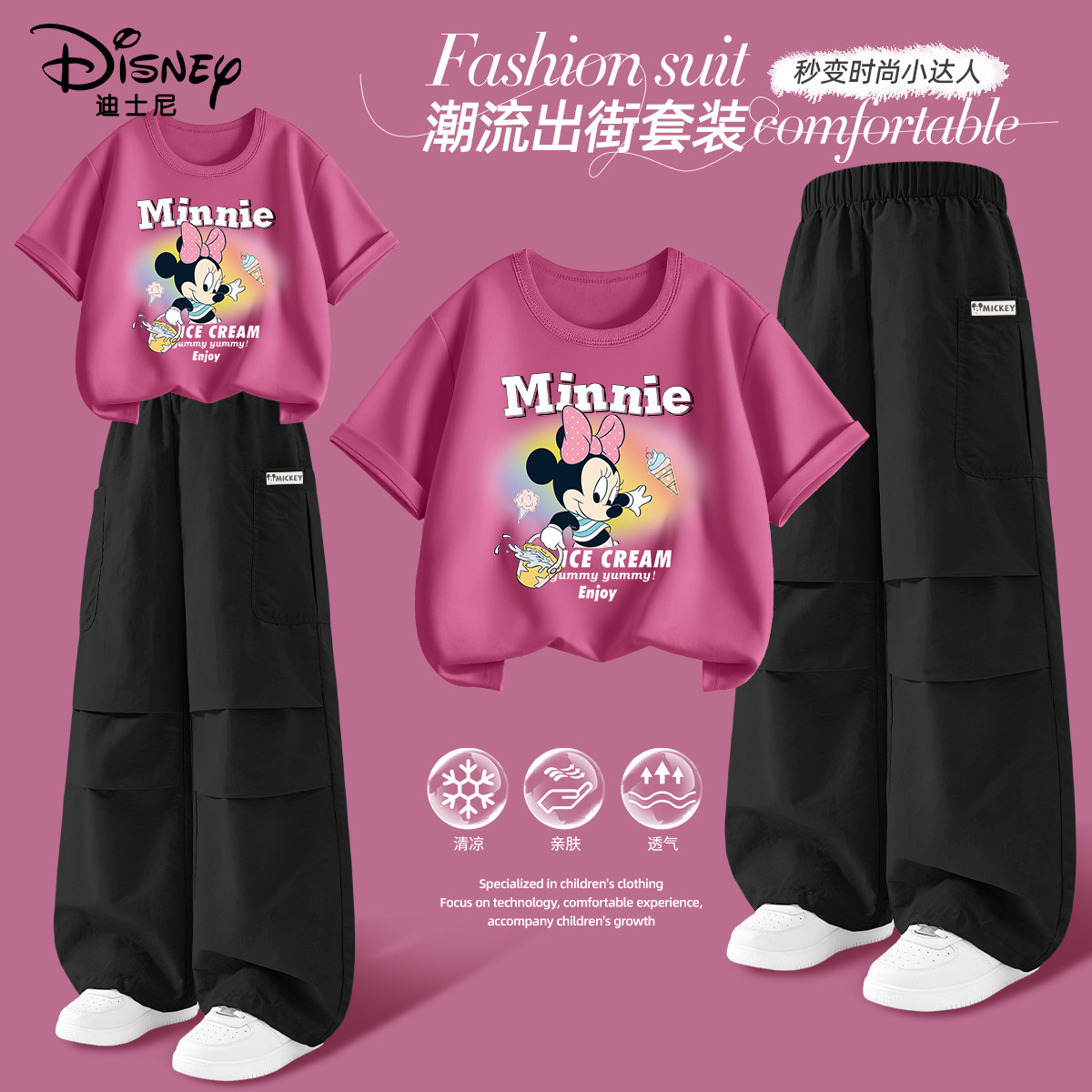 迪士尼女童短袖t恤2026新款纯棉大女孩洋气炸街套装运动儿童夏装