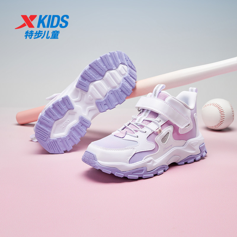 特步女童鞋新款皮面魔术贴中大童儿童鞋加绒保暖运动鞋大棉鞋