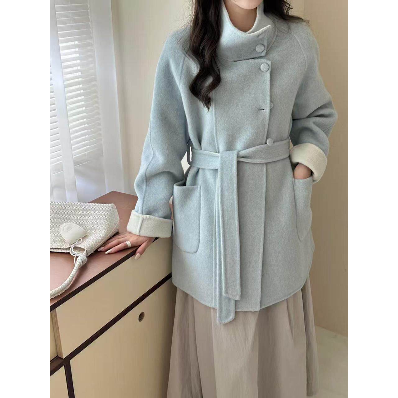 高级感立领双面羊绒大衣中长款女小个子短款洋气质秋冬羊毛呢外套