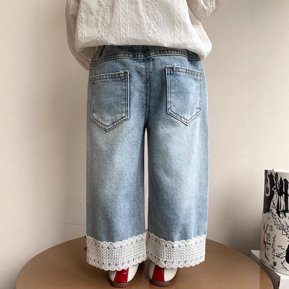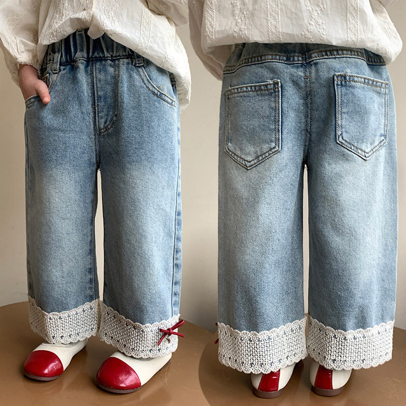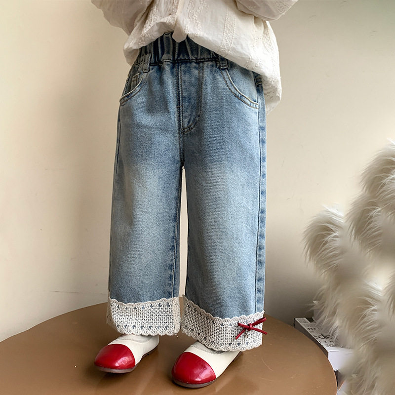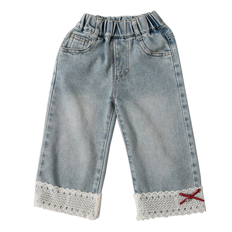 女款春装裤子女童独特超好看炸街花边蝴蝶结牛仔直筒裤女孩中小童