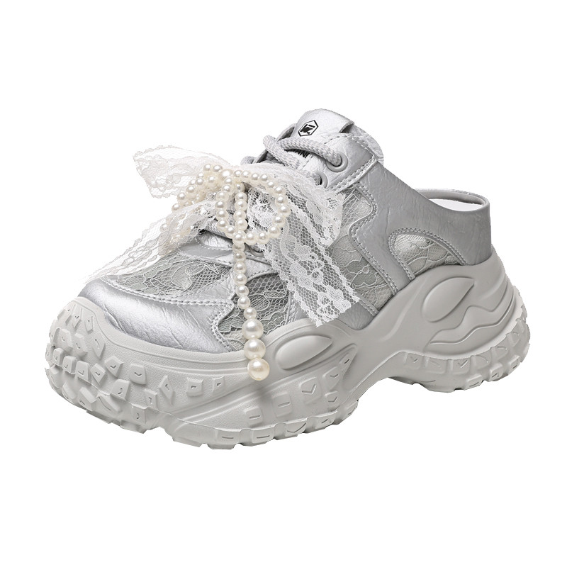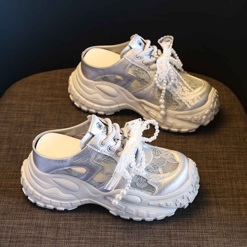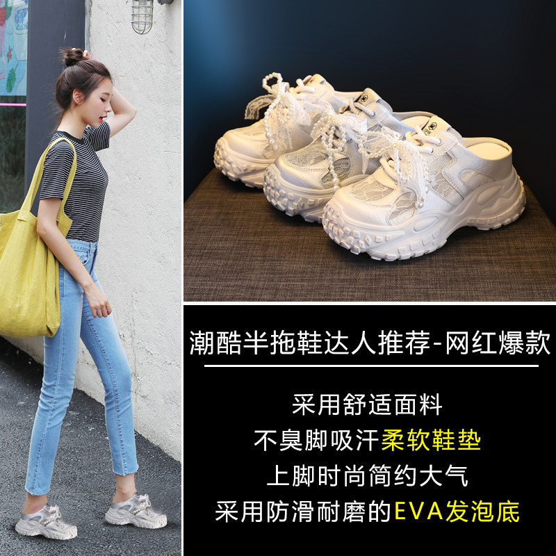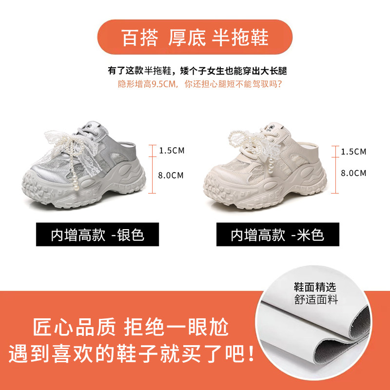 内增高10CM蕾丝包头半拖鞋女2025新款夏季透气懒人一脚蹬松糕托鞋