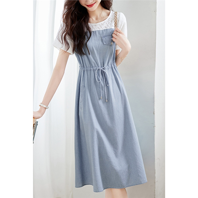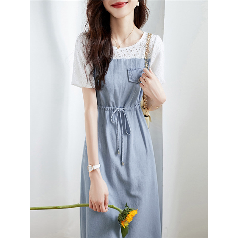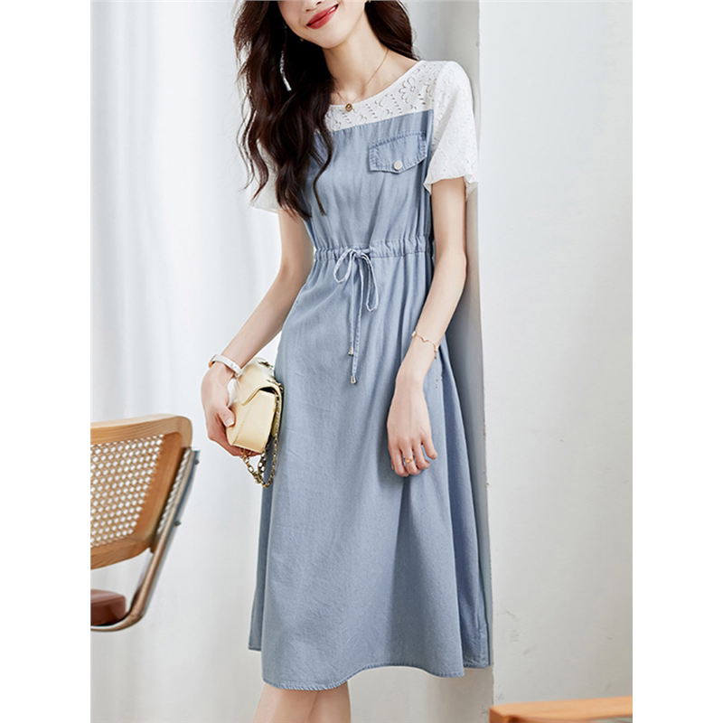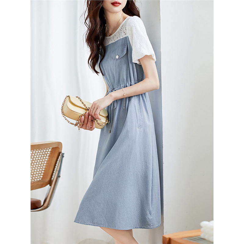 夏季薄款拼接假两件牛仔连衣裙女夏装2025新款气质小个子中长裙子