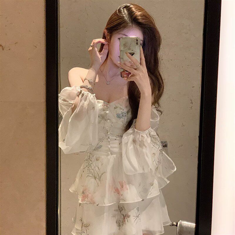 法式一字肩长袖碎花连衣裙女春秋小个子高级感气质收腰仙女蓬蓬裙