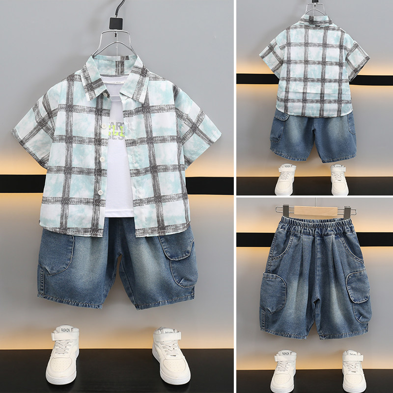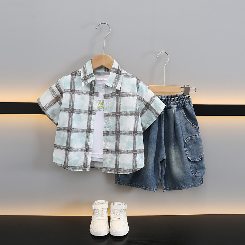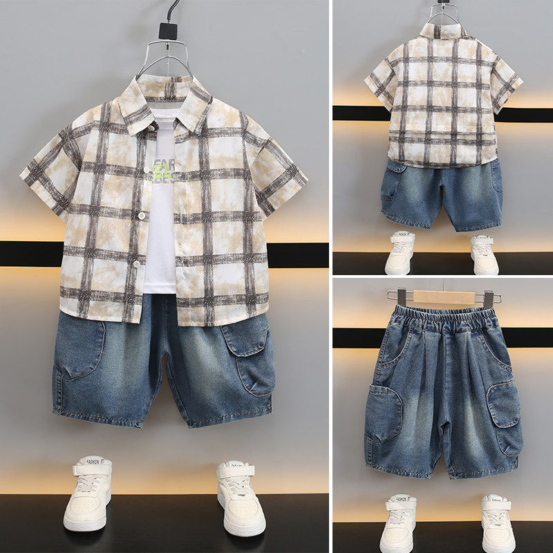 311线报网描述:小黄鸭男童夏季套装宝宝格子衬衫条纹三件套