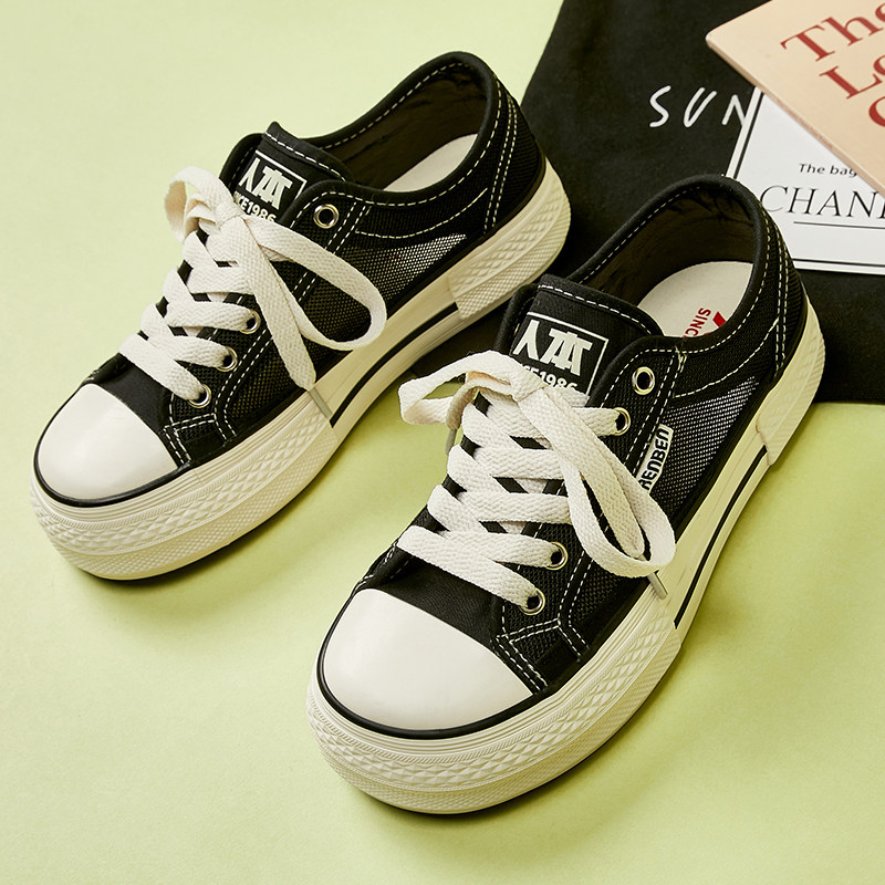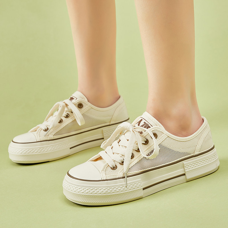 人本厚底女鞋圆头网面帆布鞋休闲透气百搭系带板鞋米色薄款网眼鞋