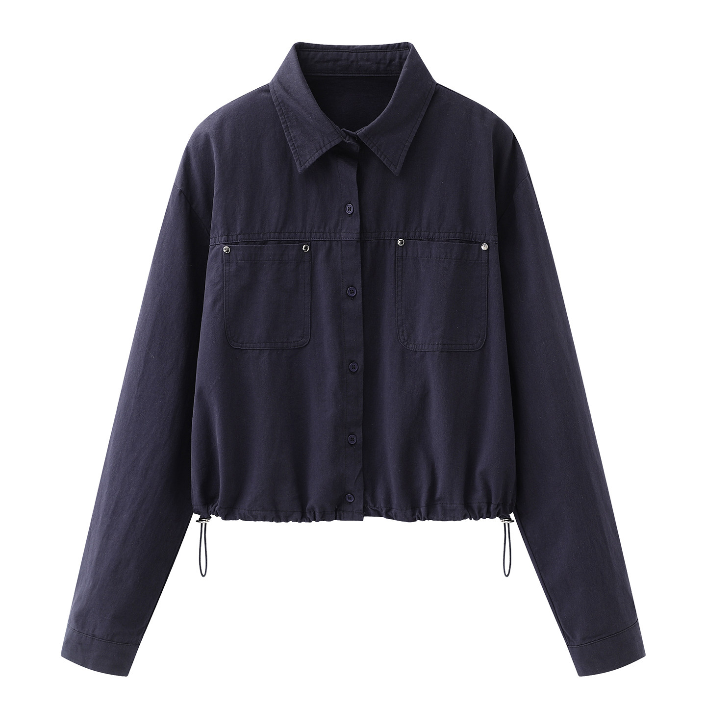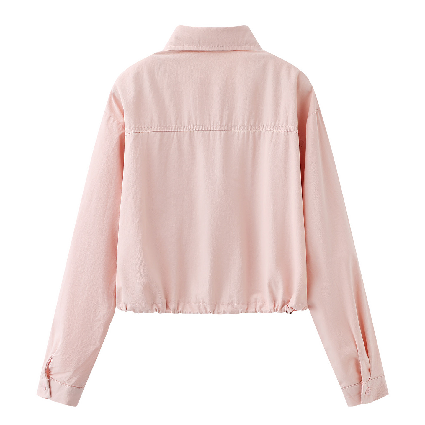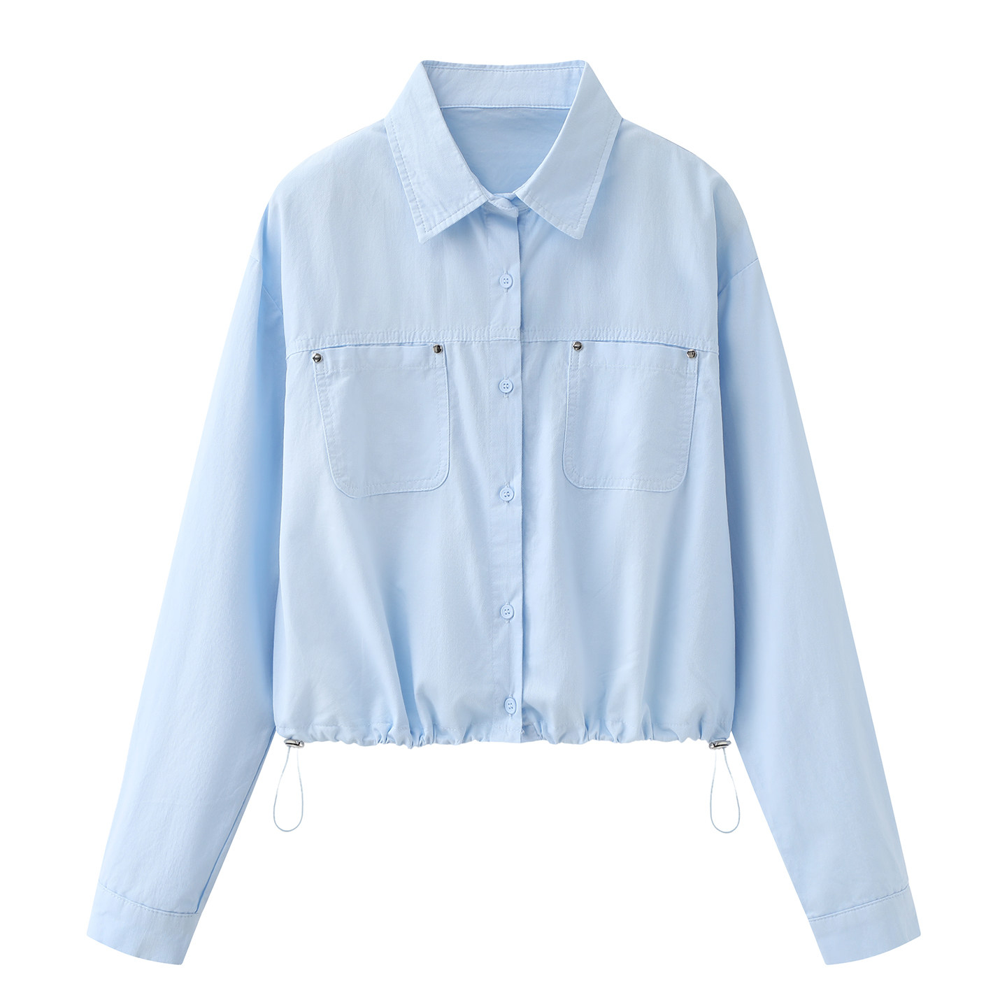 白色工装长袖翻领衬衫外套女2026春款薄款下摆抽绳短款小个子上衣
