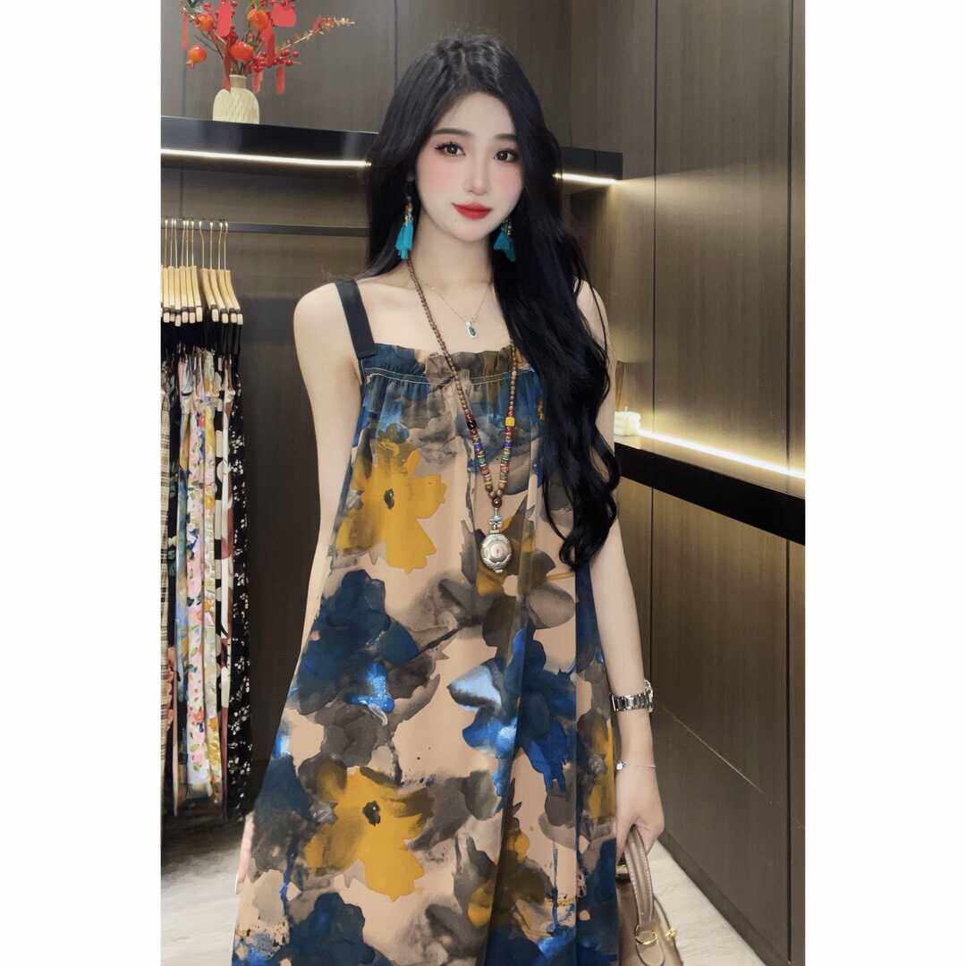 轻奢宽松吊带中长款裙子印花2026女新款夏季大码A字裙时尚连衣裙
