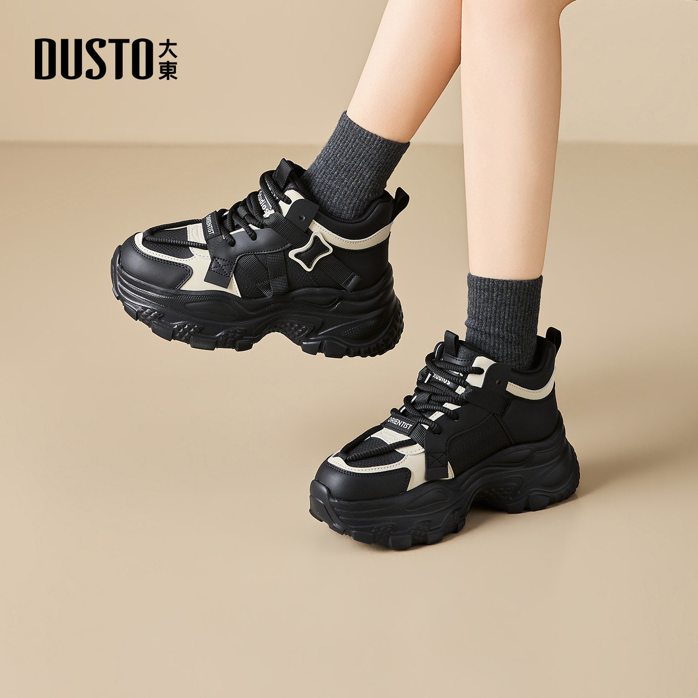 大东官方黑色老爹鞋女款2026新款春季显脚小厚底增高鞋休闲运动鞋