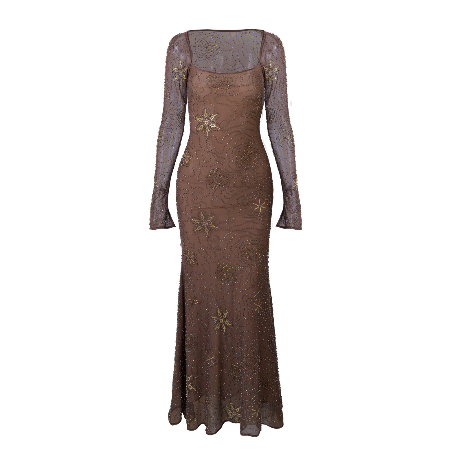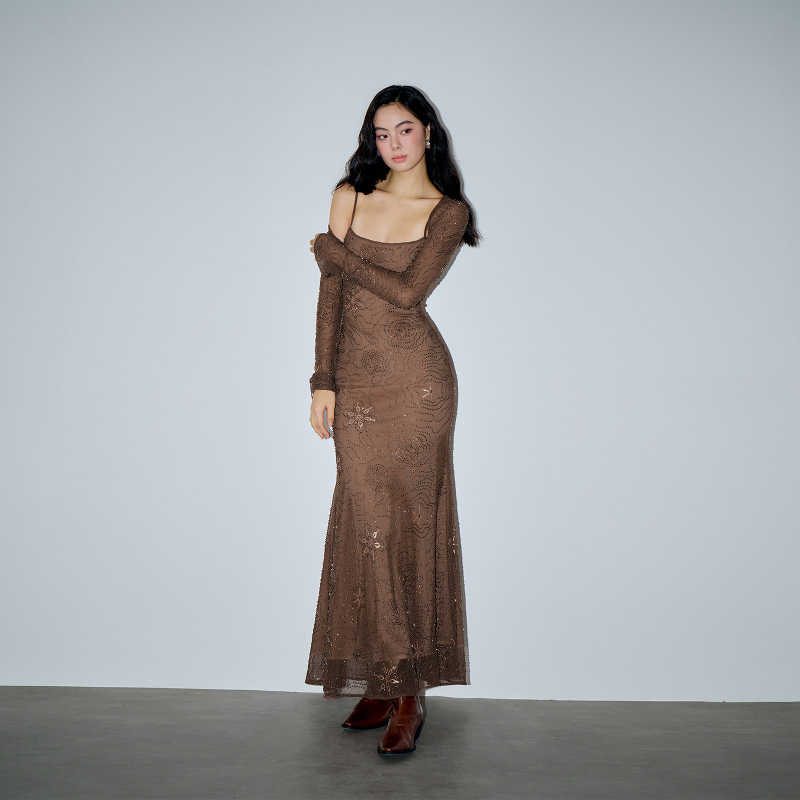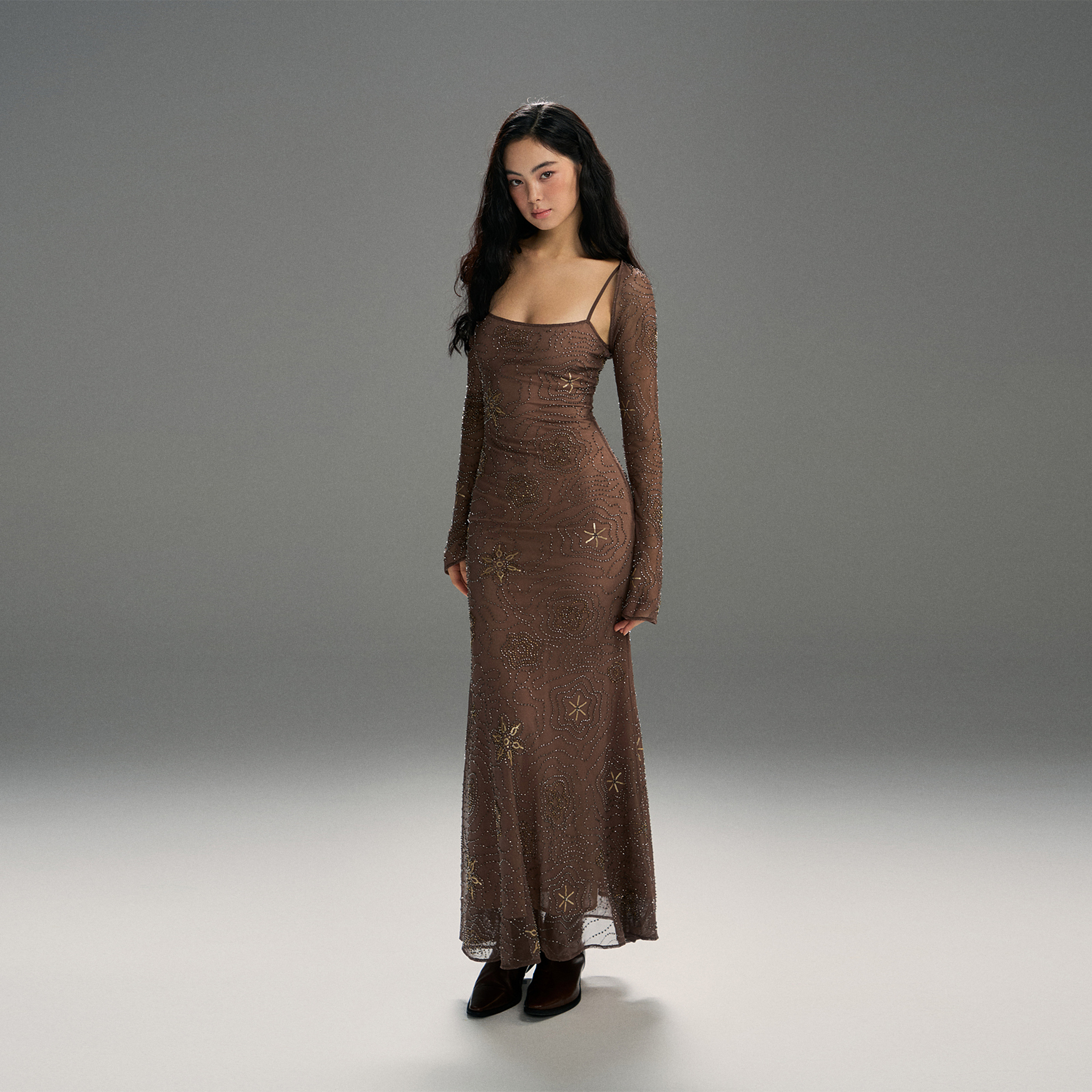 PynkiSwear 棕色珠片刺绣长款吊带连衣裙/长袖坎肩罩衫修身套装女