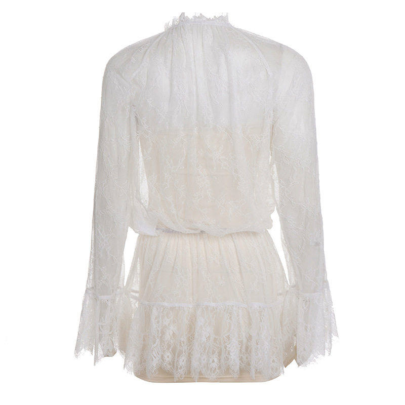 外贸法式透视蕾丝收腰甜美可爱连衣裙圆领喇叭长袖宽松短裙两件套