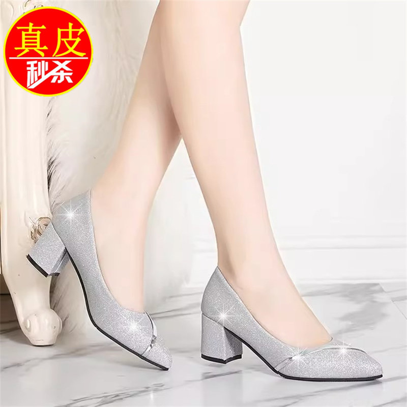 品牌撤柜真皮礼仪粗跟宴会女鞋春秋单鞋百搭中跟浅口尖头高跟鞋潮