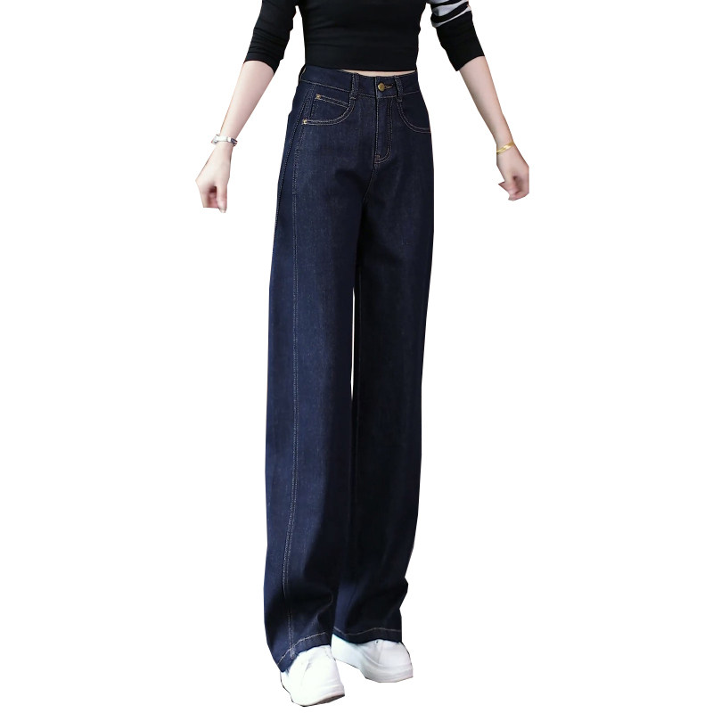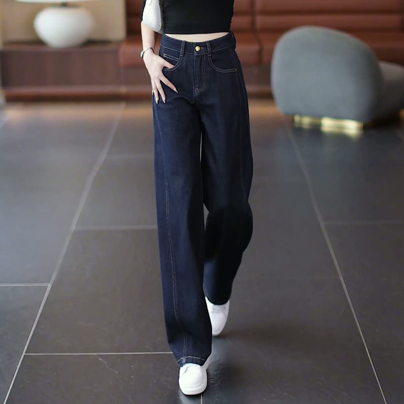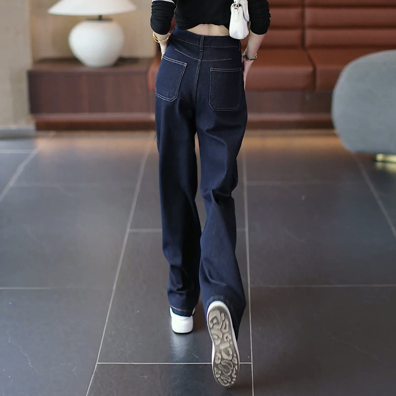 深蓝色弯刀牛仔裤女冬季加绒加厚2025新款高腰松弛感直筒阔腿裤子