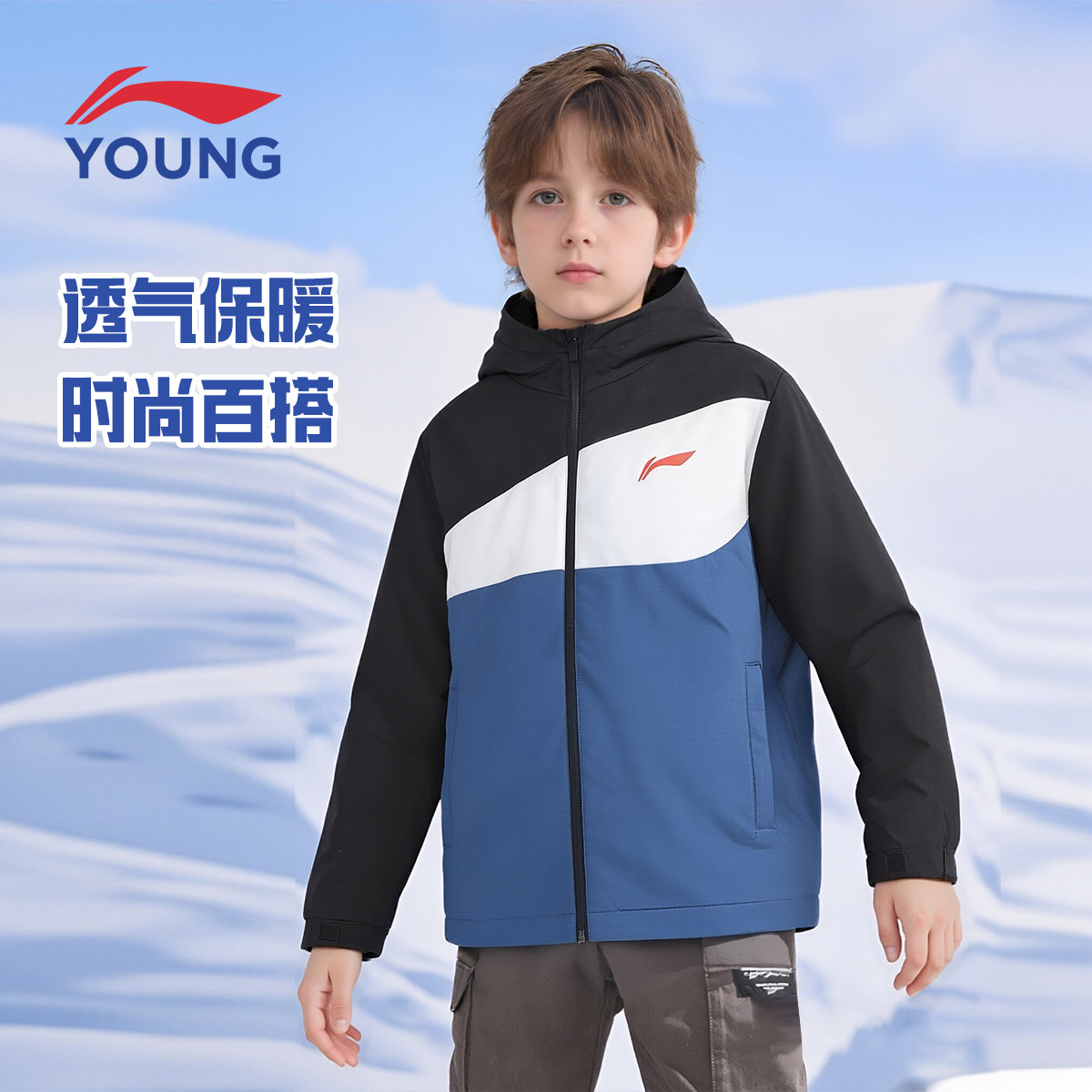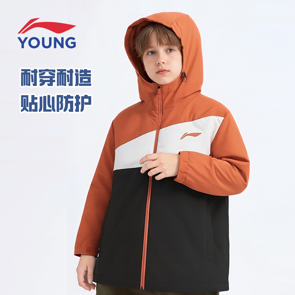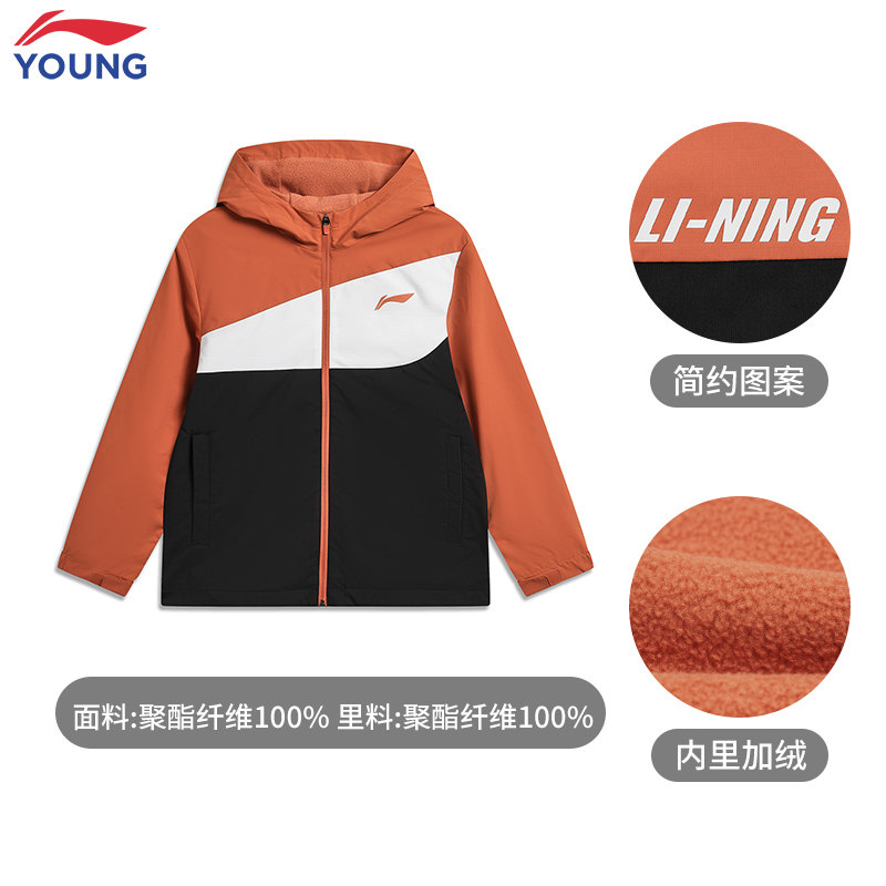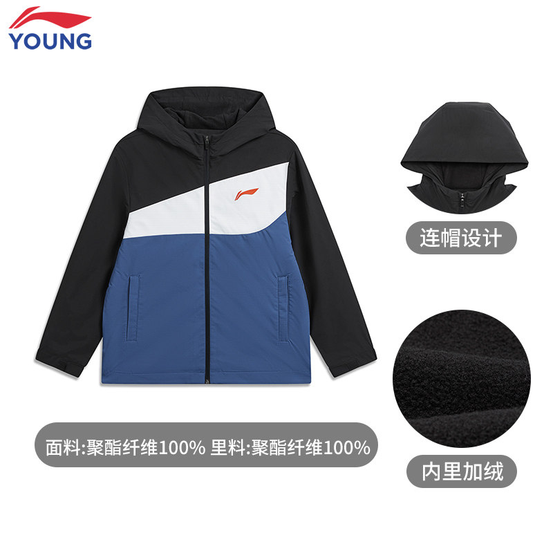 李宁儿童运动风衣男大童2026春季新款青少年宽松加绒连帽软壳外套