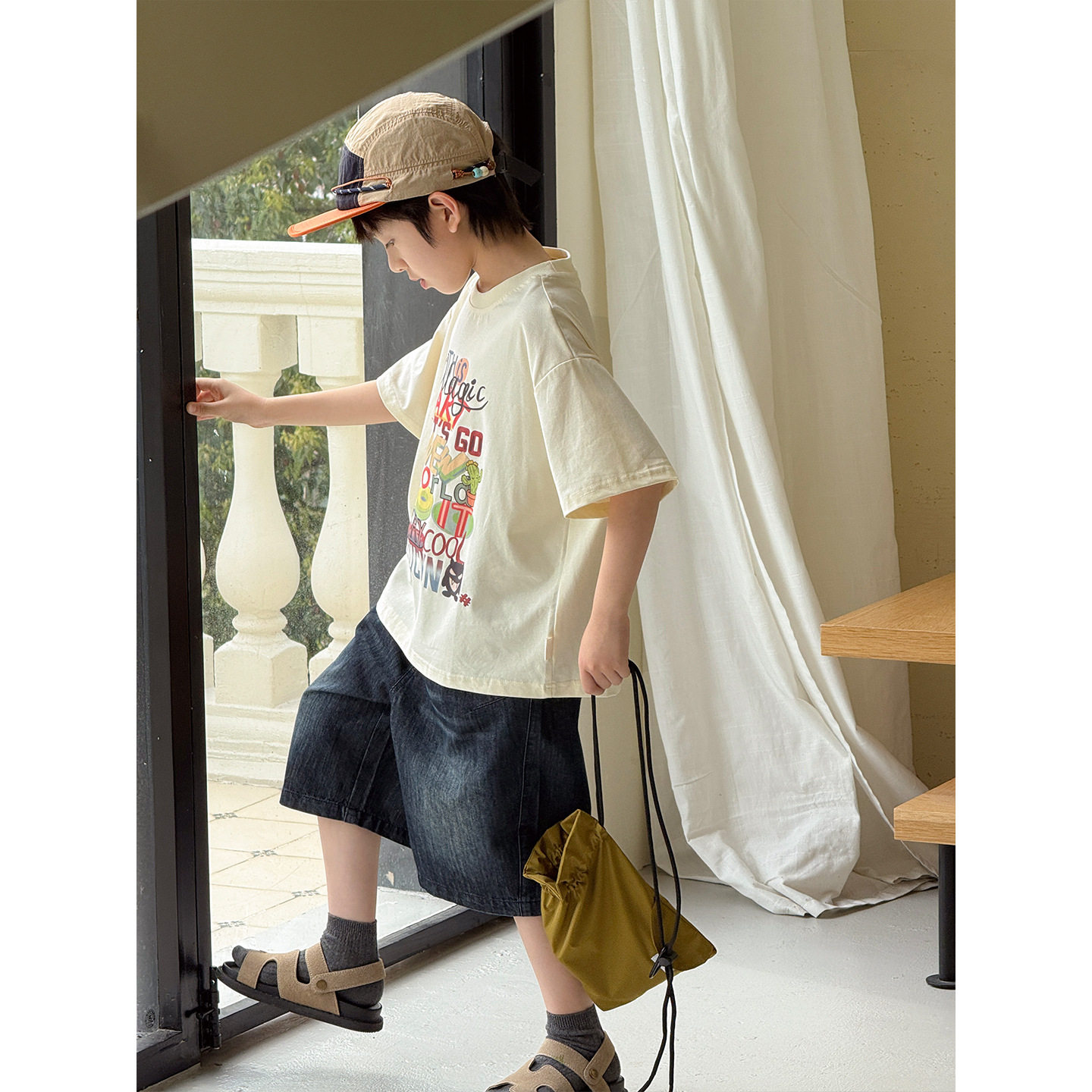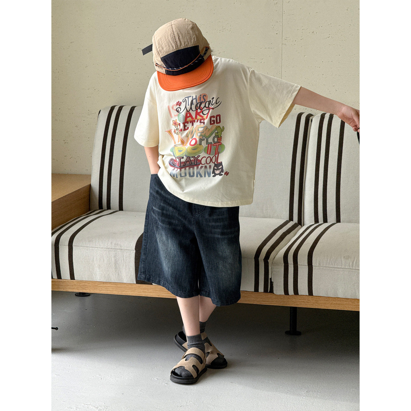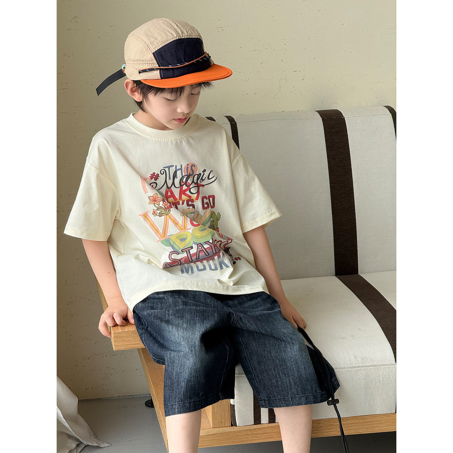 2026夏装韩版美式印花儿童短袖休闲宽松男女童彩色字母百搭T恤潮