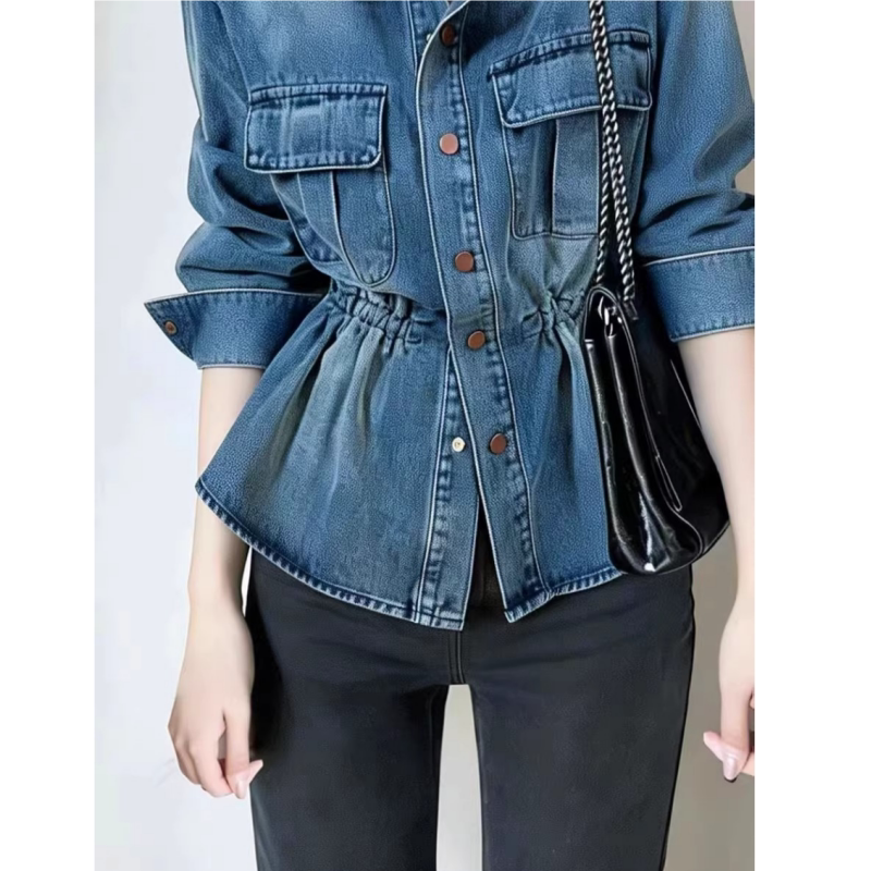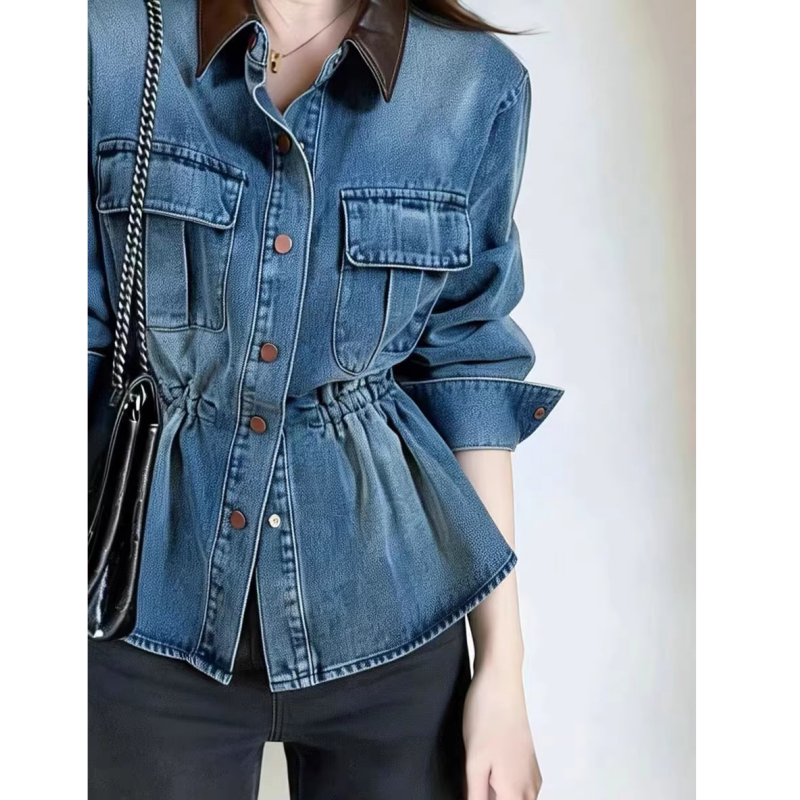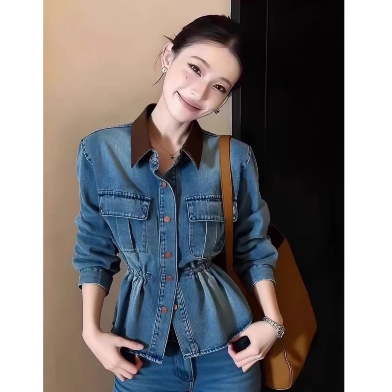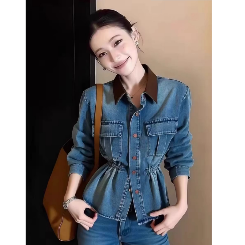 2026早春新款收腰显瘦牛仔衬衫女款港风复古撞色翻领掐腰上衣外套
