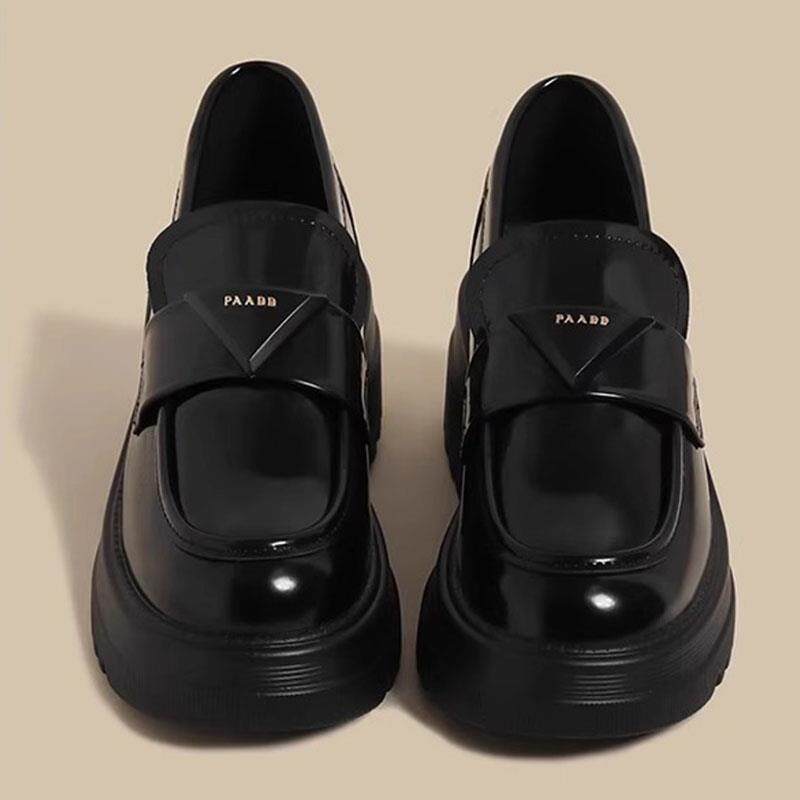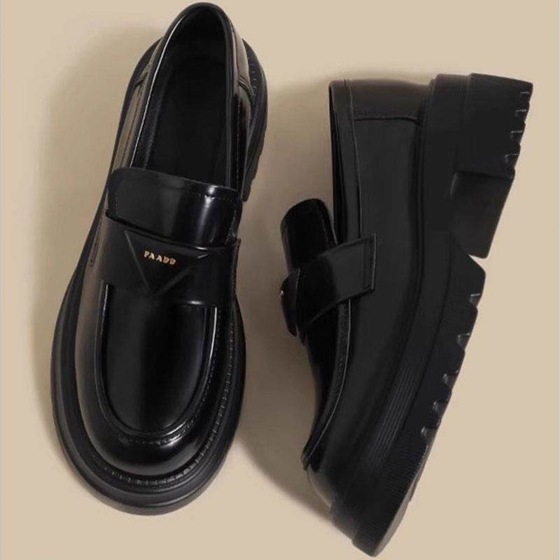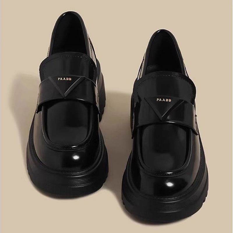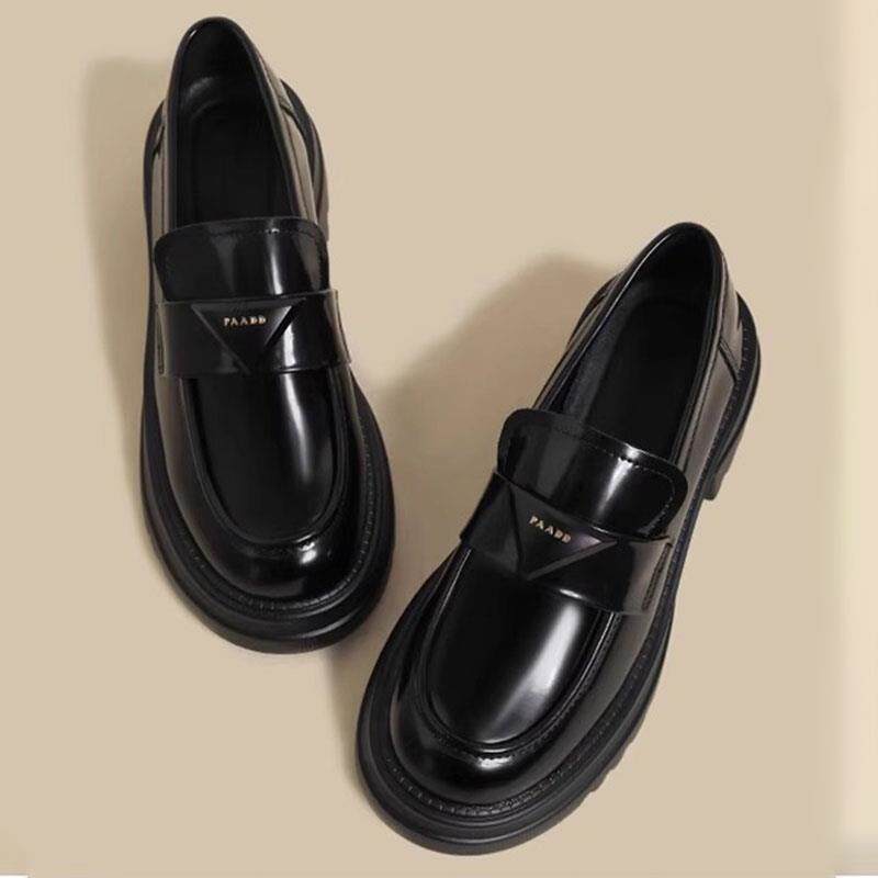 香港真皮厚底增高乐福鞋女2025秋季新款英伦风三角标小皮鞋单鞋