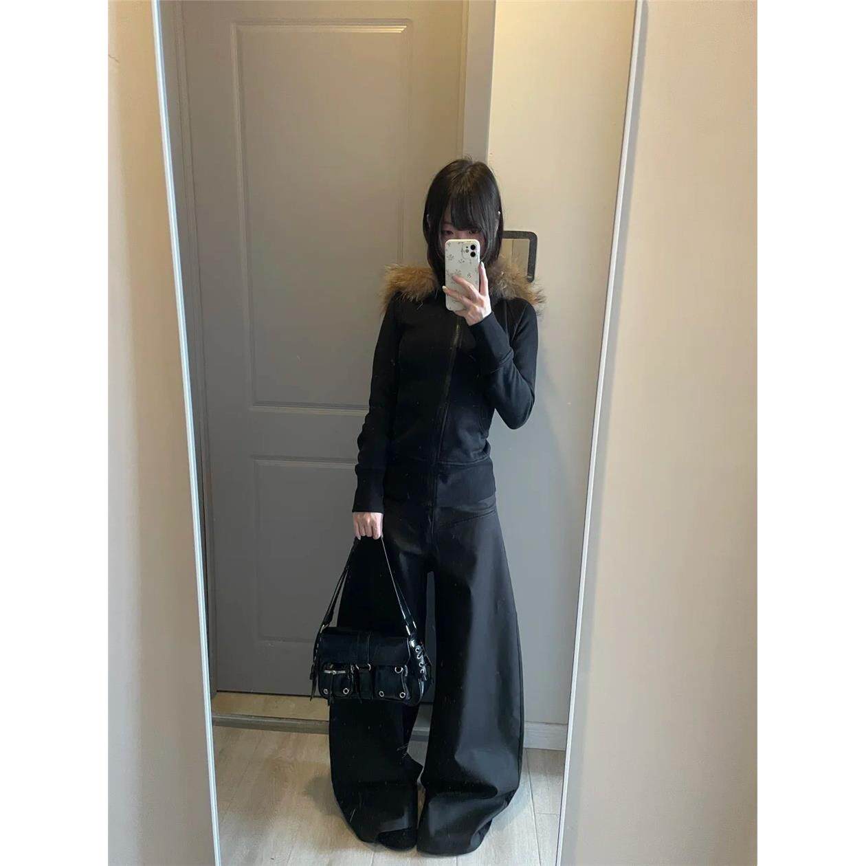 黑色修身毛领卫衣外套女款秋冬天短款收腰冬季韩系早秋季穿搭上衣