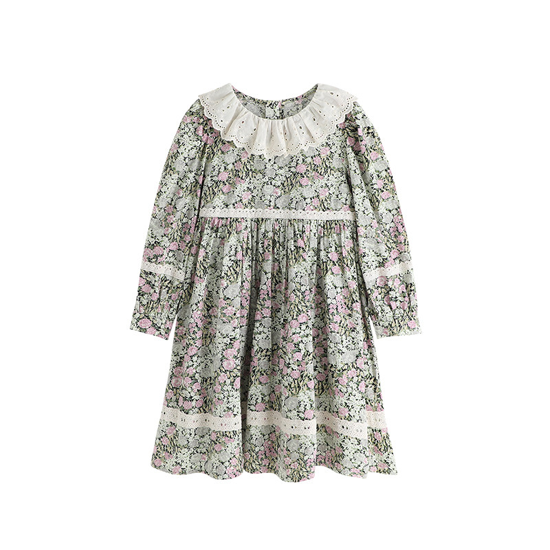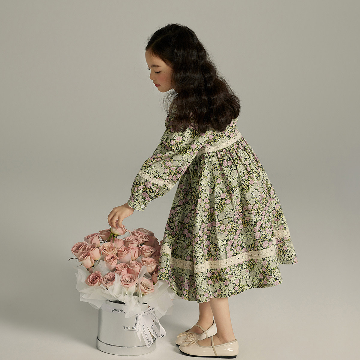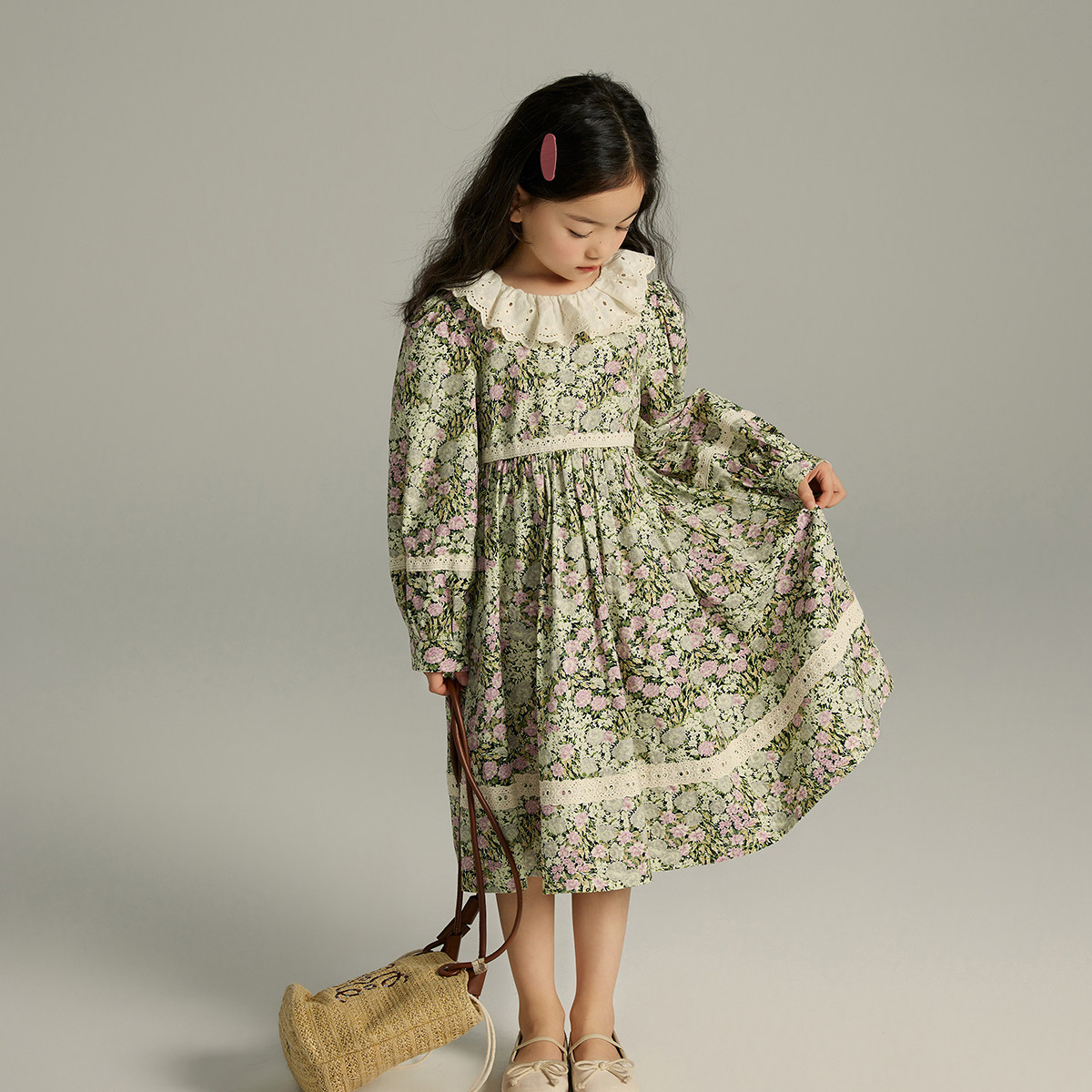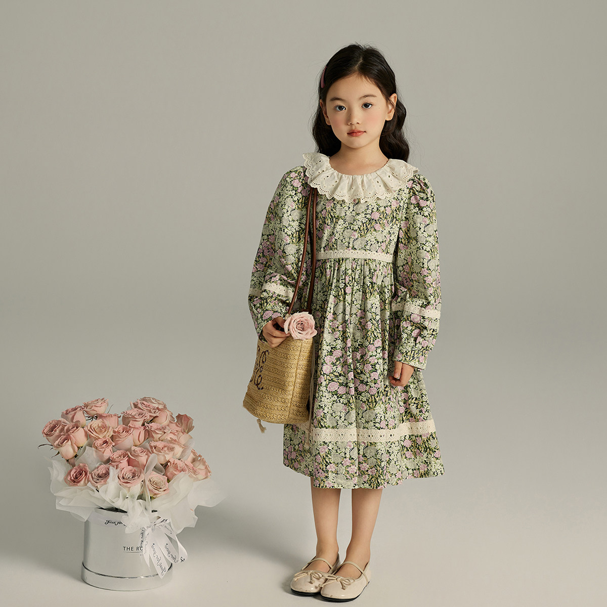 布丁哈鲁春装女童2026春秋新款儿童休闲洋气大童花边领碎花连衣裙