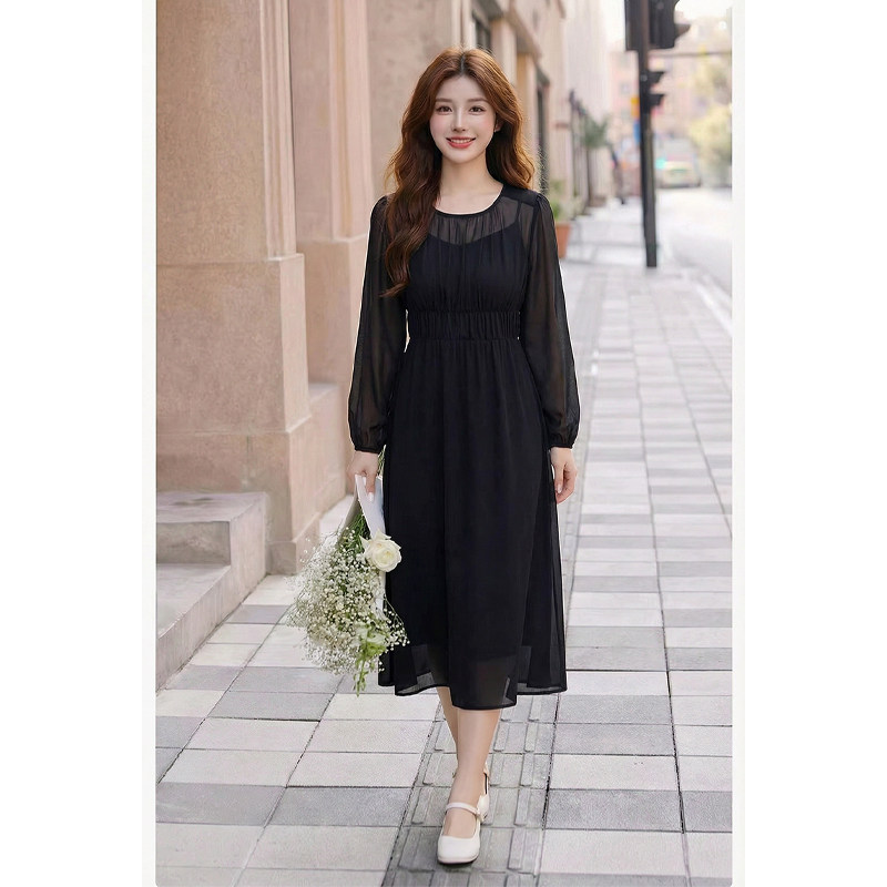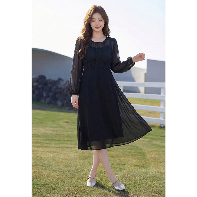 早春大码女装连衣裙2026新款显瘦胖MM气质高级感假两件黑色雪纺裙