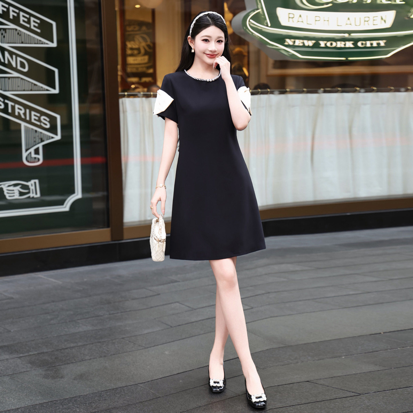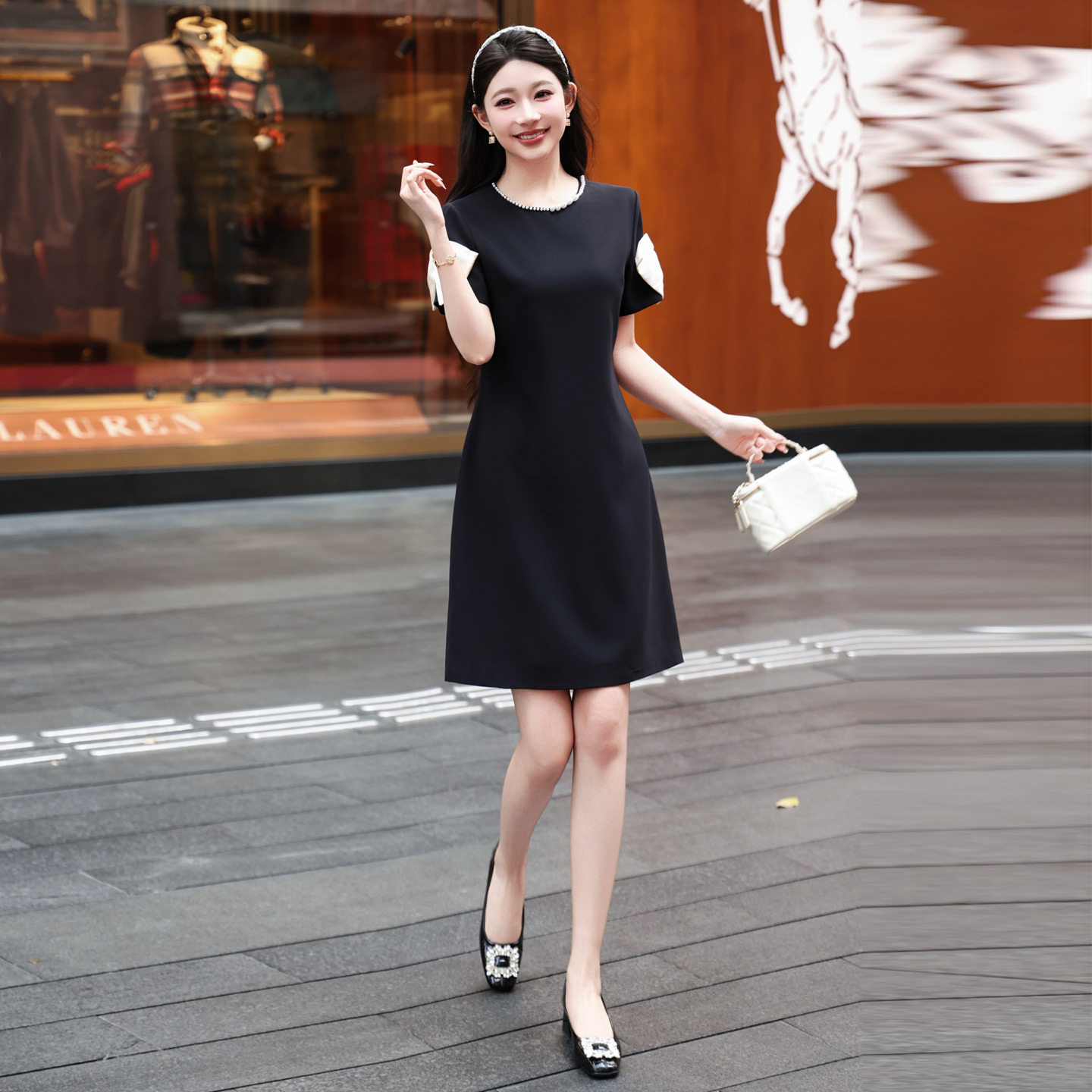 日常裙子女装2026新款春夏季中长款气质重工订珠蝴蝶结通勤连衣裙