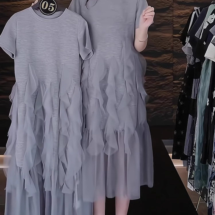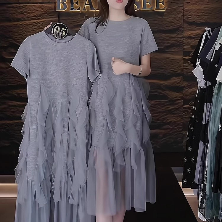 大码遮肚子减龄网纱拼接连衣裙女夏季胖mm洋气显瘦百搭短袖T恤裙